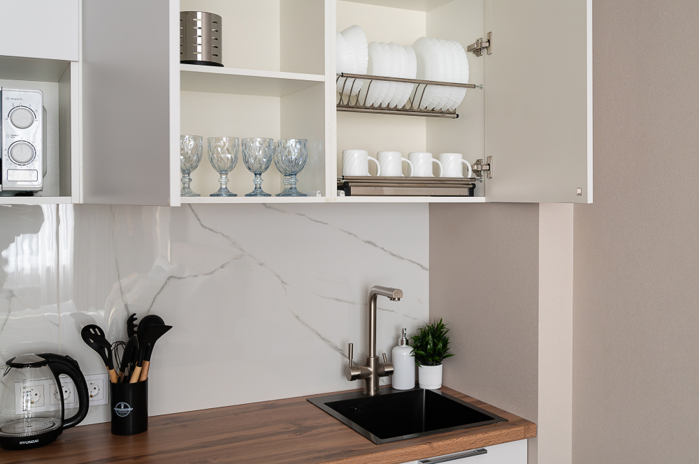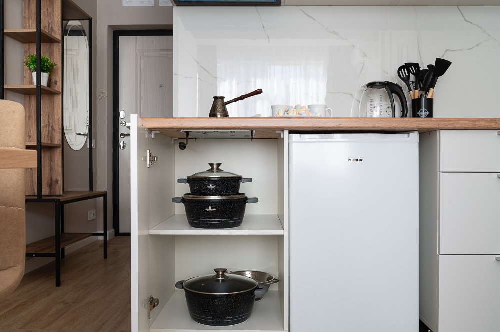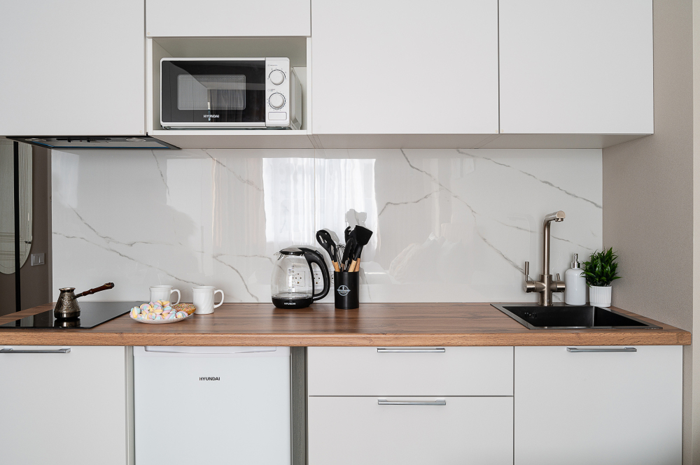 - Кухня: вся необходимая техника (мини - холодильник, плита, микроволновка, чайник) и посуда.