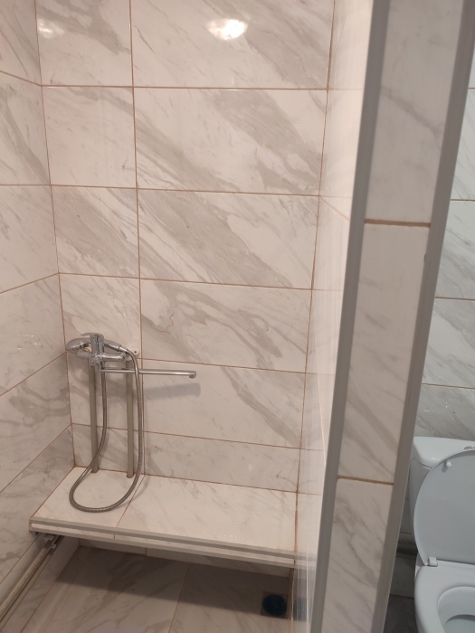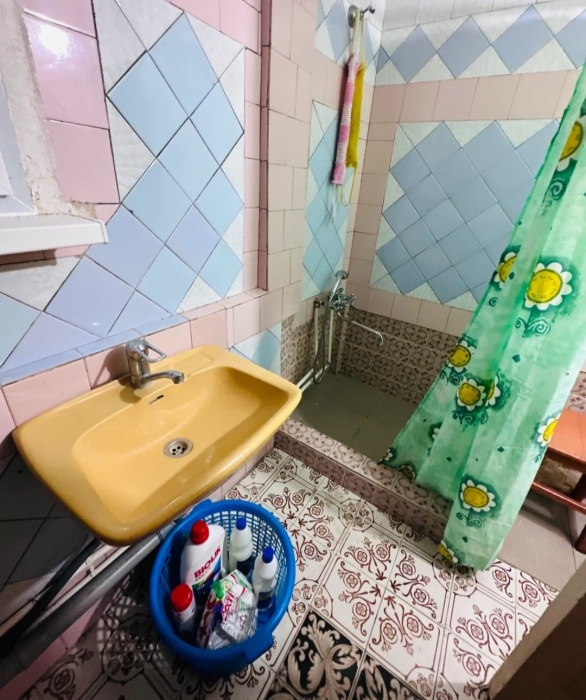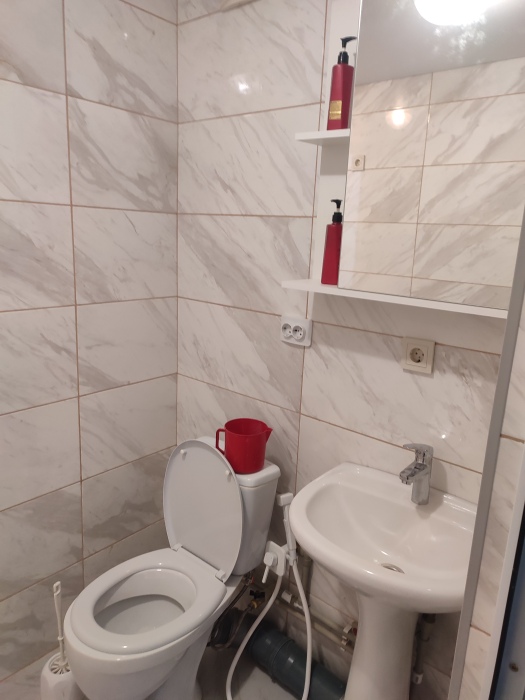 На 1 этаже (ремонт старый): зала с кондиционером, диваном, столом и стульями, прихожая, стиральная машинка, душ и туалет на 1 этаже.