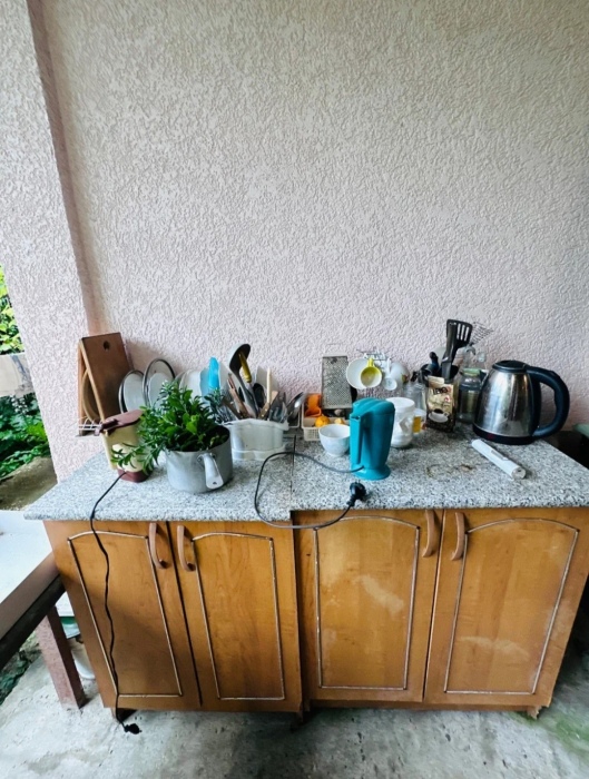 Во дворе: мангал, решетка и казан для плова/мидий, навес и летняя кухня (большой холодильник, плита, стол, стулья, микроволновка, столовые приборы, посуда).