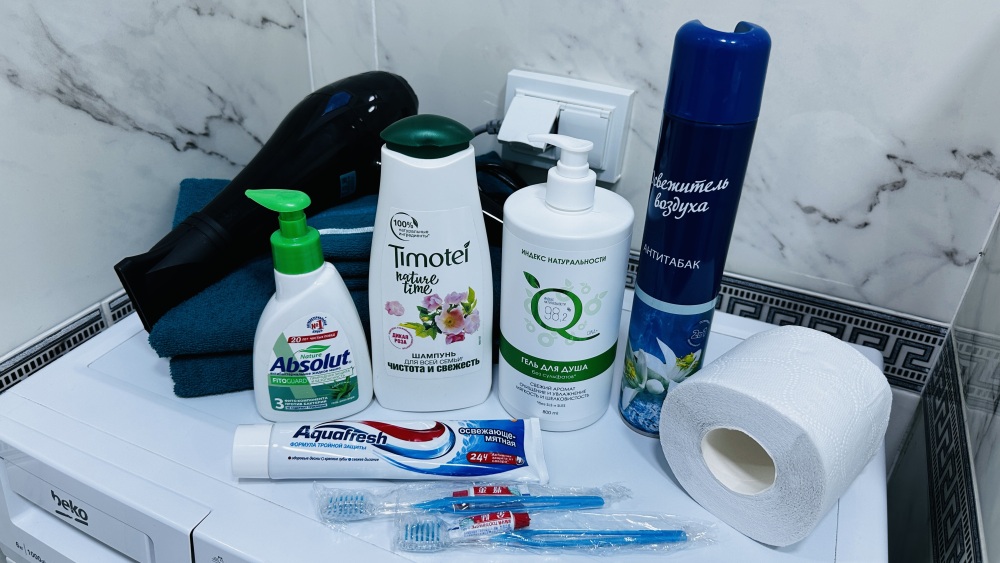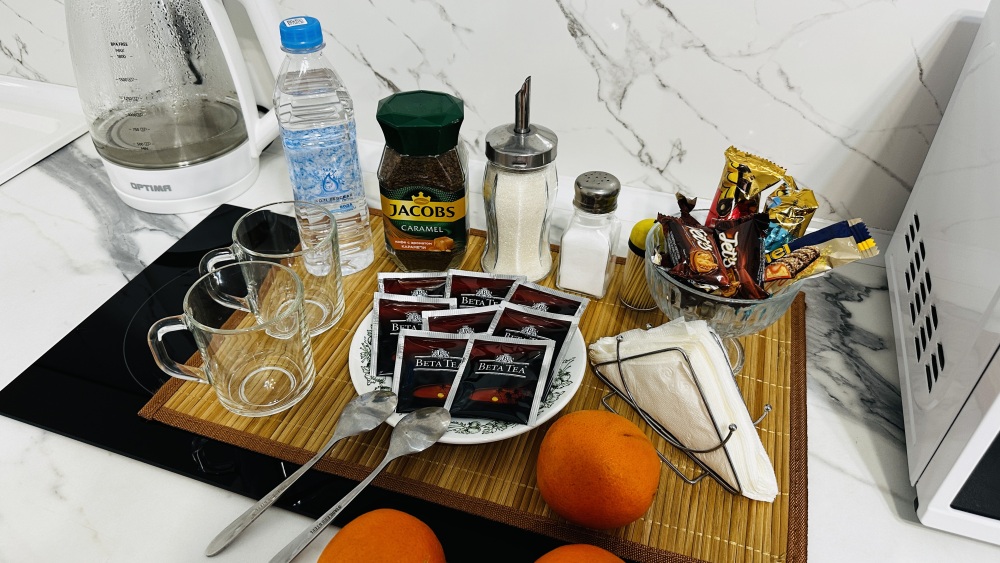 Приветственный комплимент в виде чая, кофе, конфет, а так же предметы первой необходимости (шампунь, гель для душа, зубная паста, туалетная бумага) поднимут вам настроение.