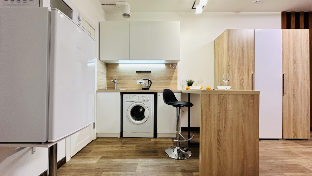 - Бытовая техника (телевизор smart тв, стиральная машина, холодильник, свч печь, индукционная плита, духовой шкаф, утюг, фен) гладильная доска, сушилка.