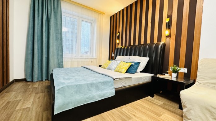 - Двухспальная кровать с ортопедическим матрасом с уже заправленным чистым постельным бельём.