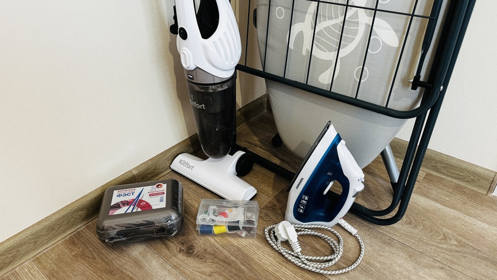 - бытовая техника (телевизор, стиральная машина, холодильник, СВЧ печь, индукционная плита, утюг, фен) гладильная доска, сушилка.