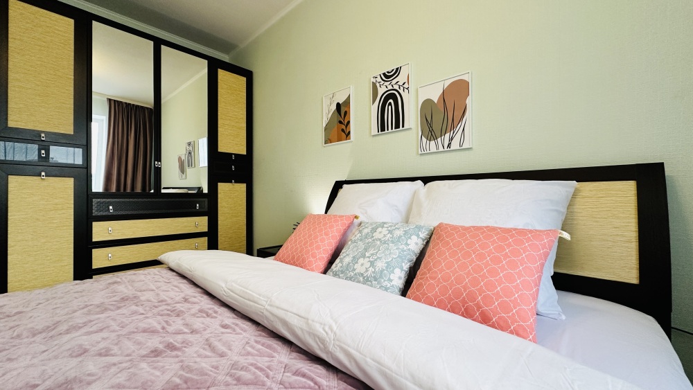 - Двухспальная кровать с ортопедическим матрасом с уже заправленным чистым постельным бельём.