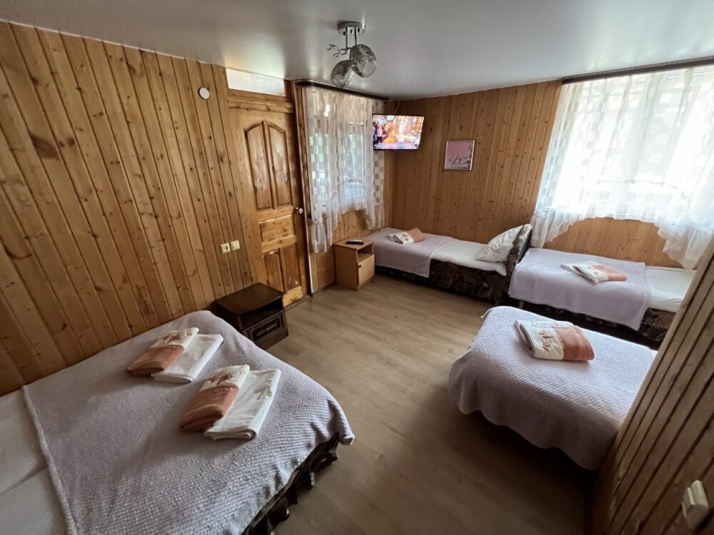 4-местный номер. Телевизор, мини холодильник, бесплатный Wi-fi. Душ и туалет общий на этаже. Постельное белье, набор полотенец. Имеется кухня со всей необходимой посудой для приготовления блюд.
