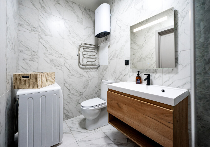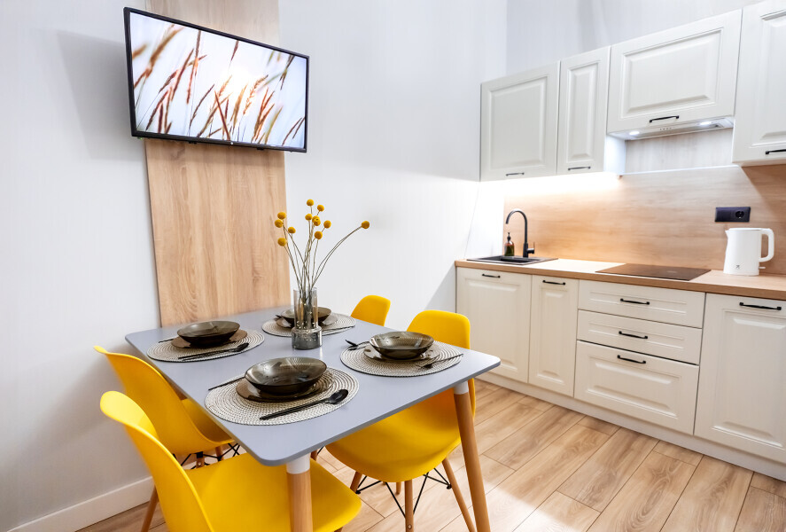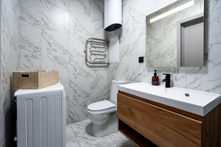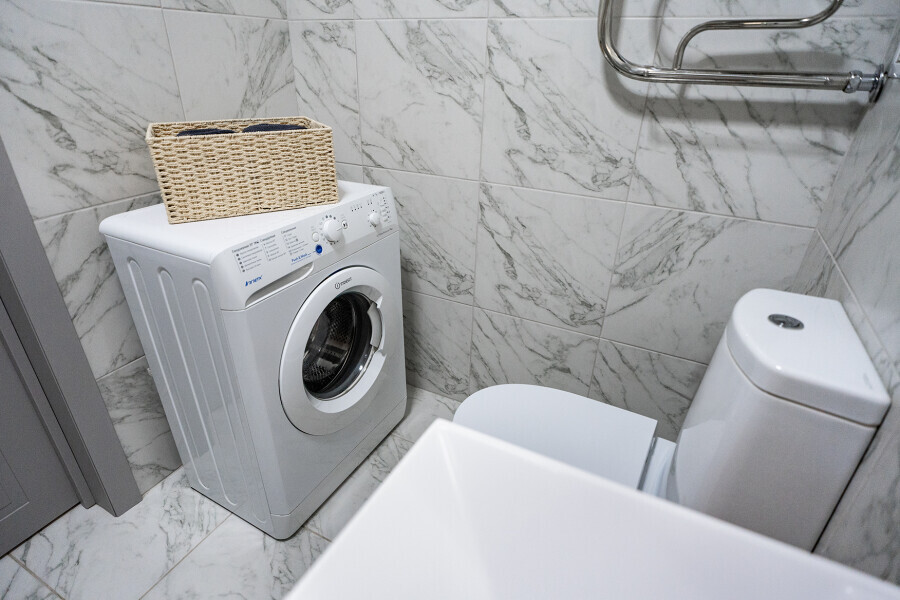 - Кухня (плита, холодильник, стиральная машина, микроволновая печь, чайник, посуда, столовые приборы).