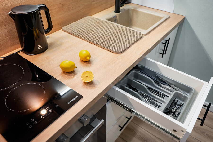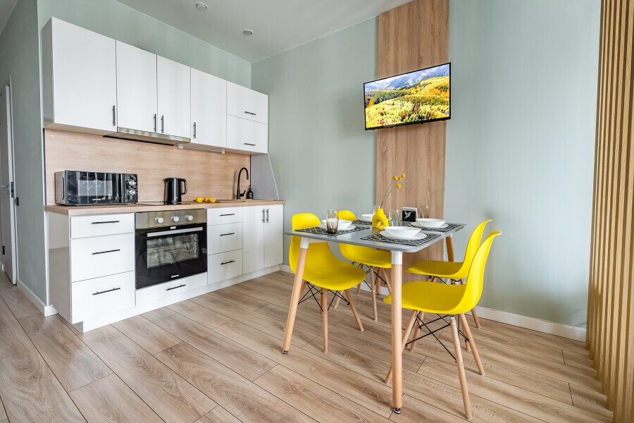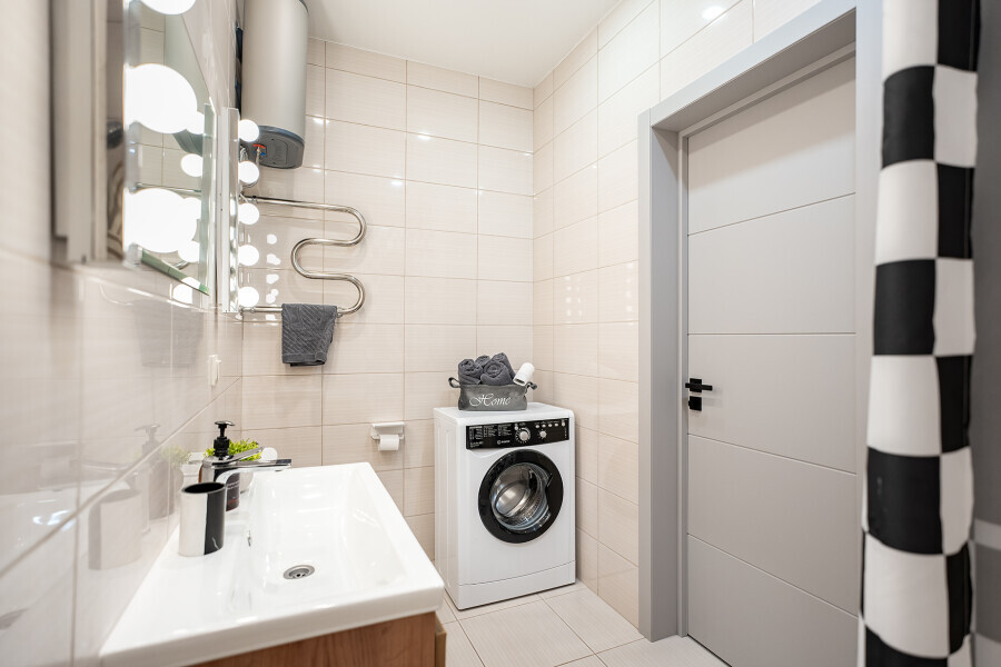 - Кухня (плита, холодильник, стиральная машина, микроволновая печь, чайник, посуда, столовые приборы).