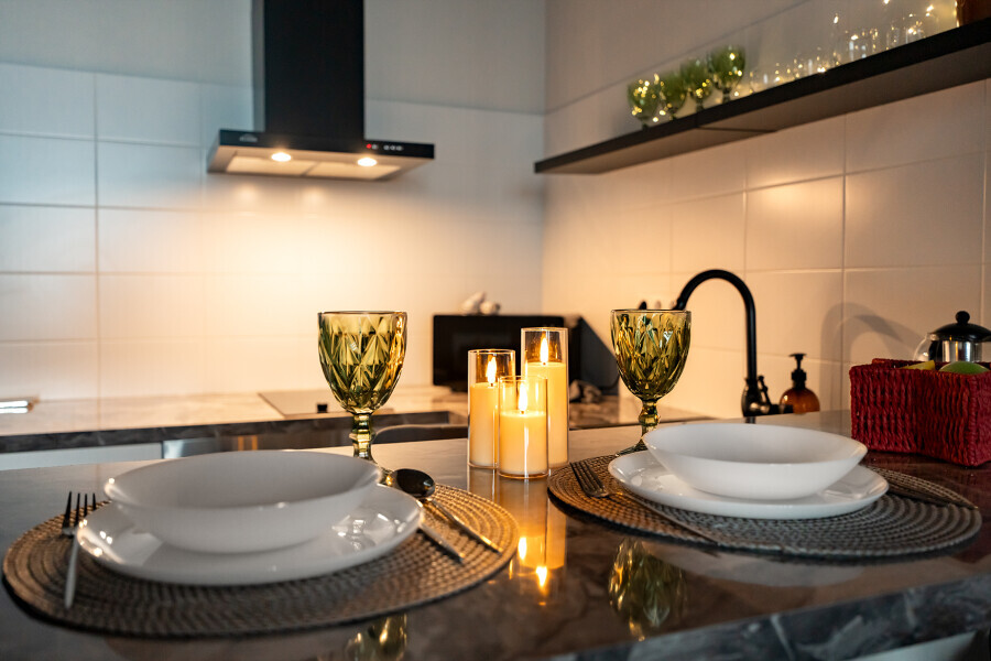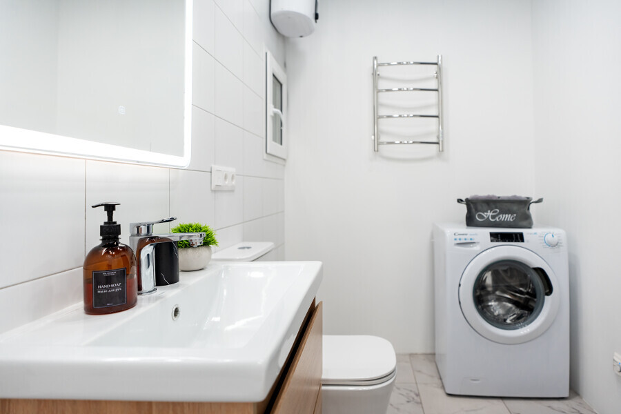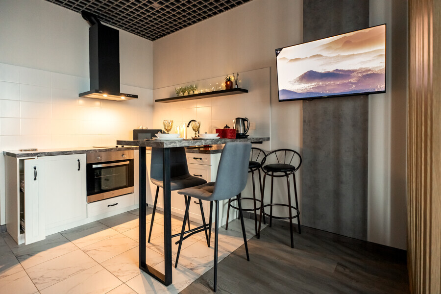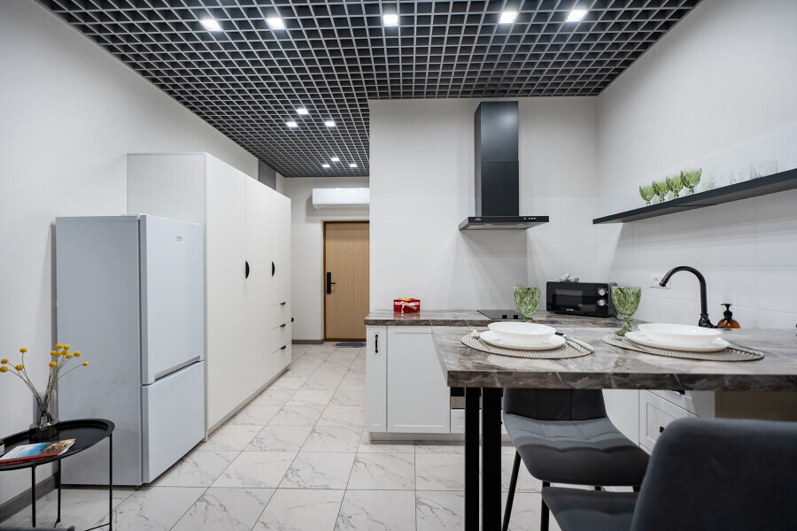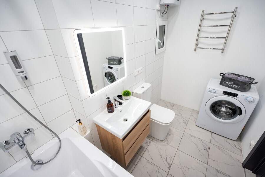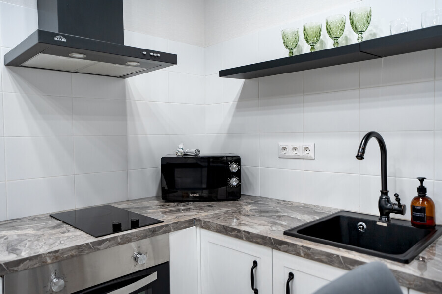 - Кухня (плита, холодильник, стиральная машина, микроволновая печь, чайник, посуда, столовые приборы).
