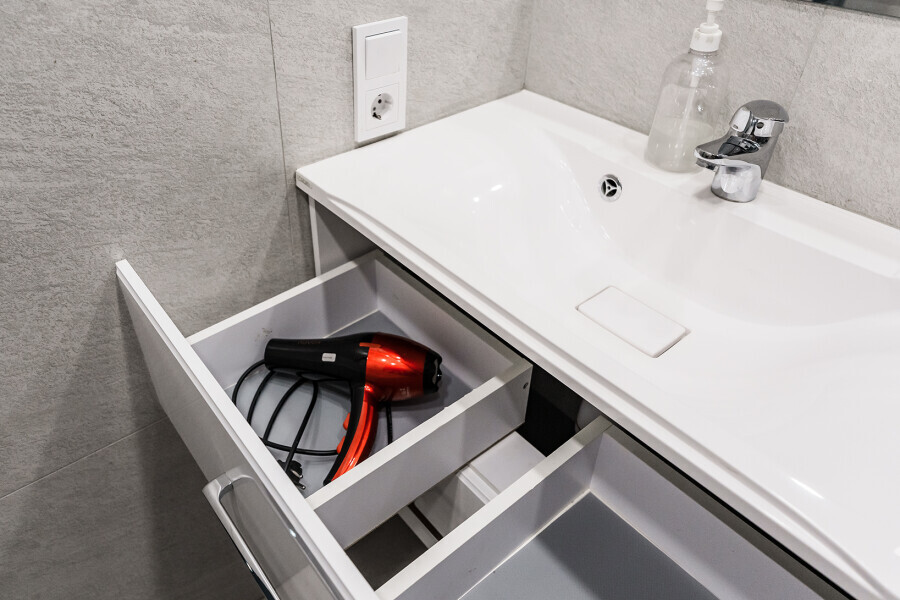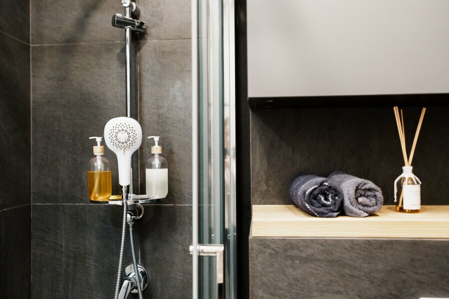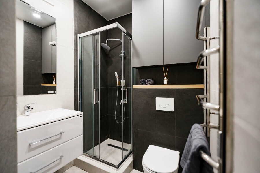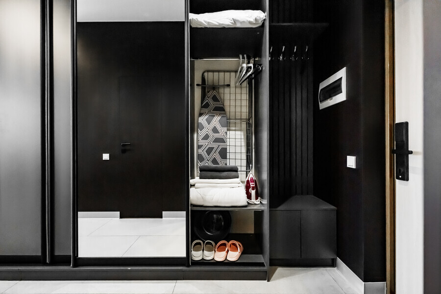 - Душевая кабина, необходимые бытовые приборы: фен, гладильная доска и утюг.