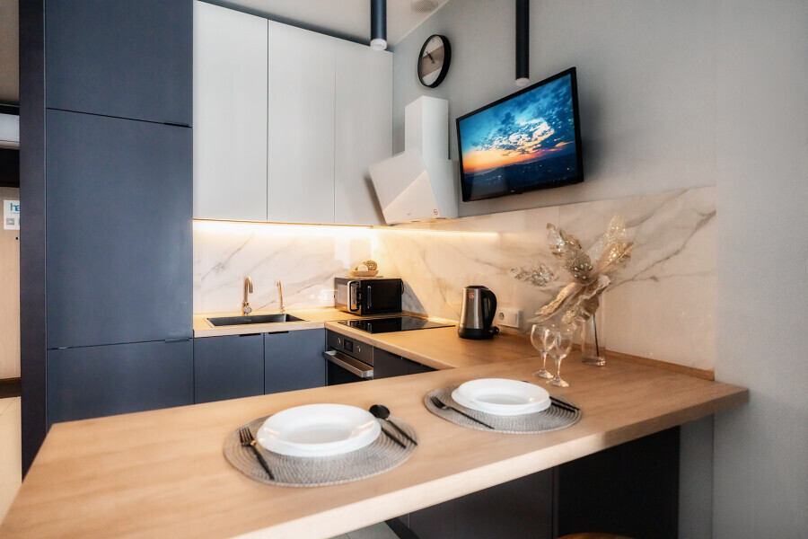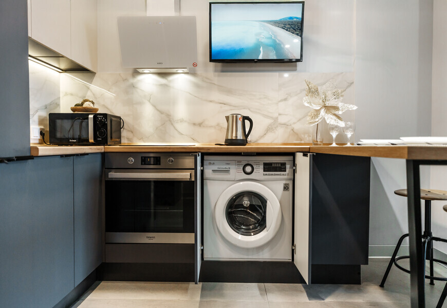 - Кухня (плита, холодильник, стиральная машина, микроволновая печь, чайник, посуда, столовые приборы).