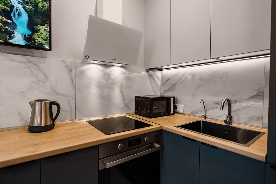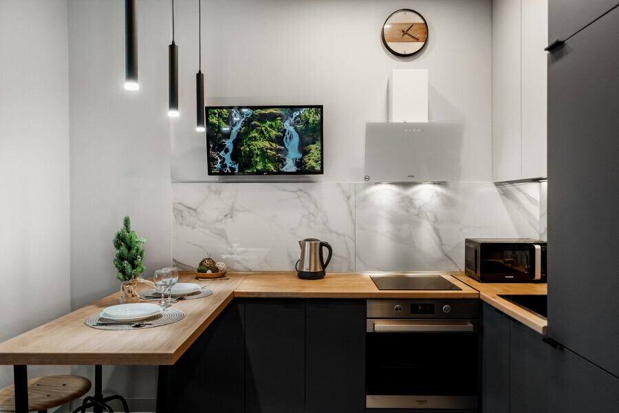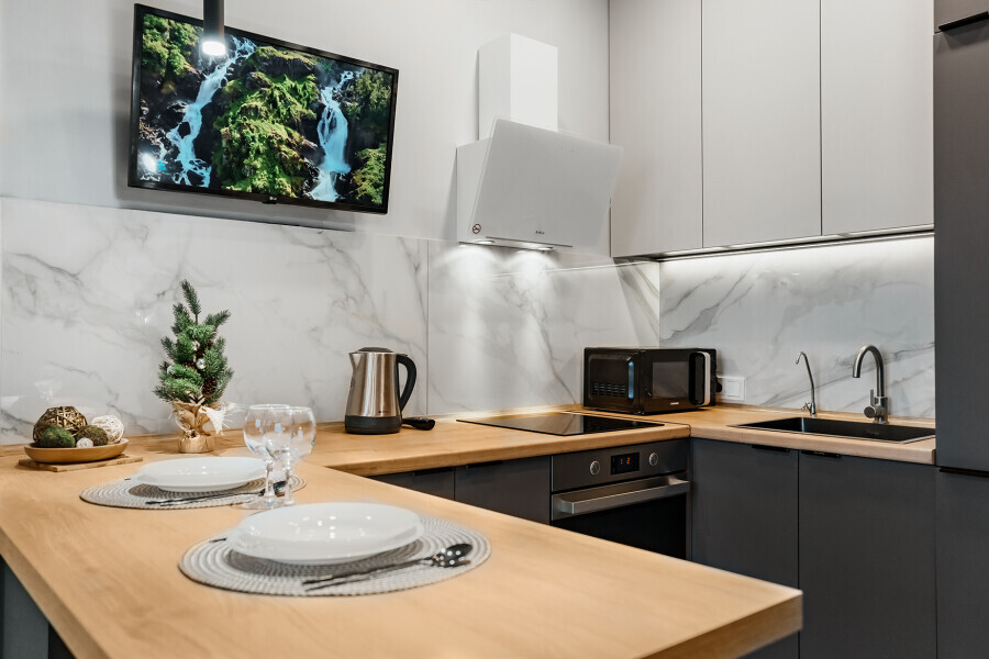 - Кухня (плита, холодильник, стиральная машина, микроволновая печь, чайник, посуда, столовые приборы).