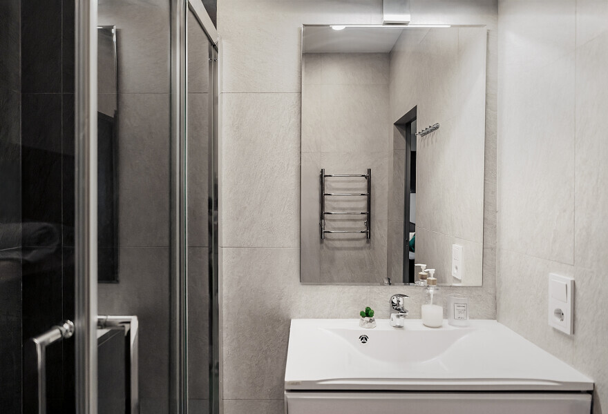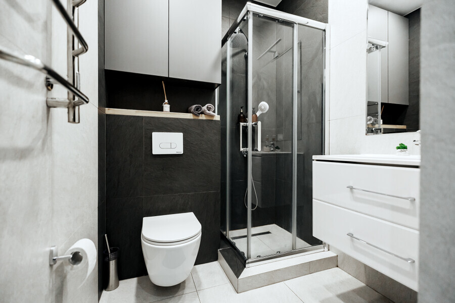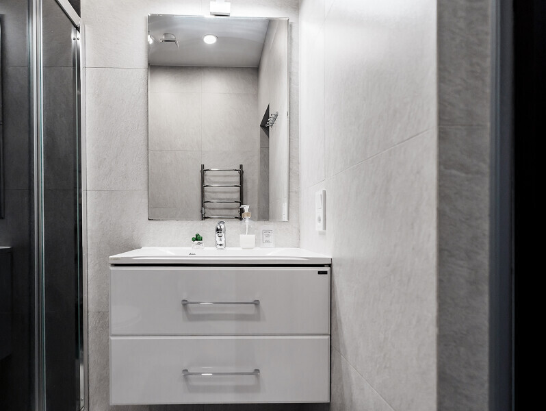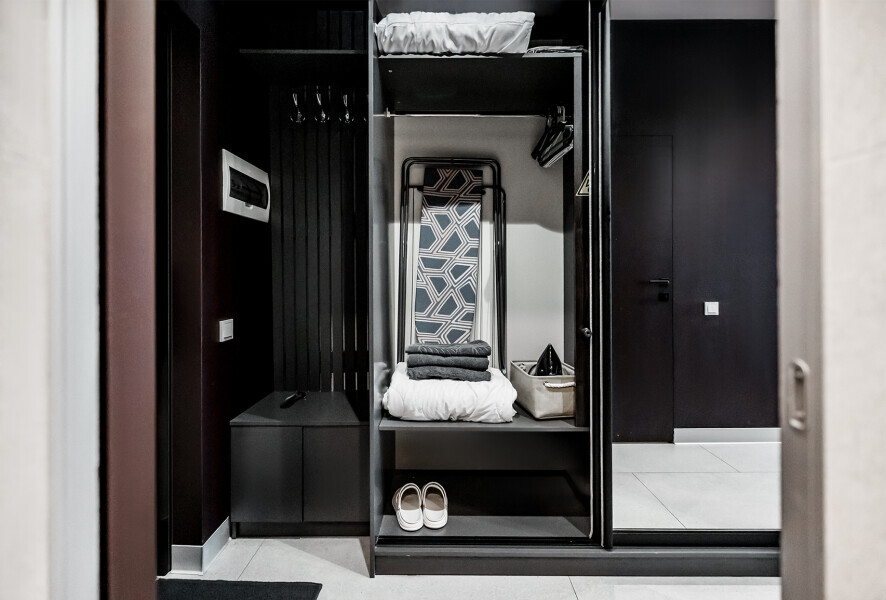 - Душевая кабина, необходимые бытовые приборы: фен, гладильная доска и утюг.