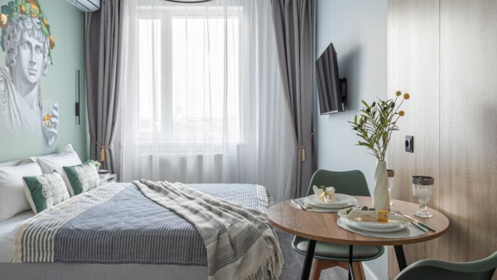 Каждая студия оформлена в неповторимом греческом стиле. Особенность интерьера — роспись ручной работы, посвященная одному из богов Олимпа. Это не просто место для проживания, это погружение в атмосферу мифов и эстетики.