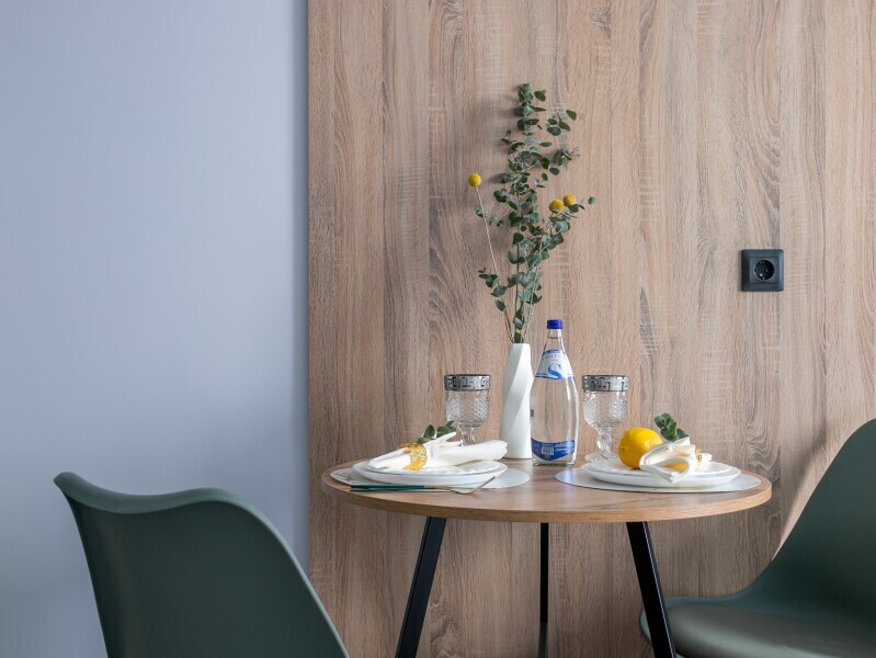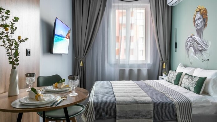 Каждая студия оформлена в неповторимом греческом стиле. Особенность интерьера — роспись ручной работы, посвященная одному из богов Олимпа. Это не просто место для проживания, это погружение в атмосферу мифов и эстетики.