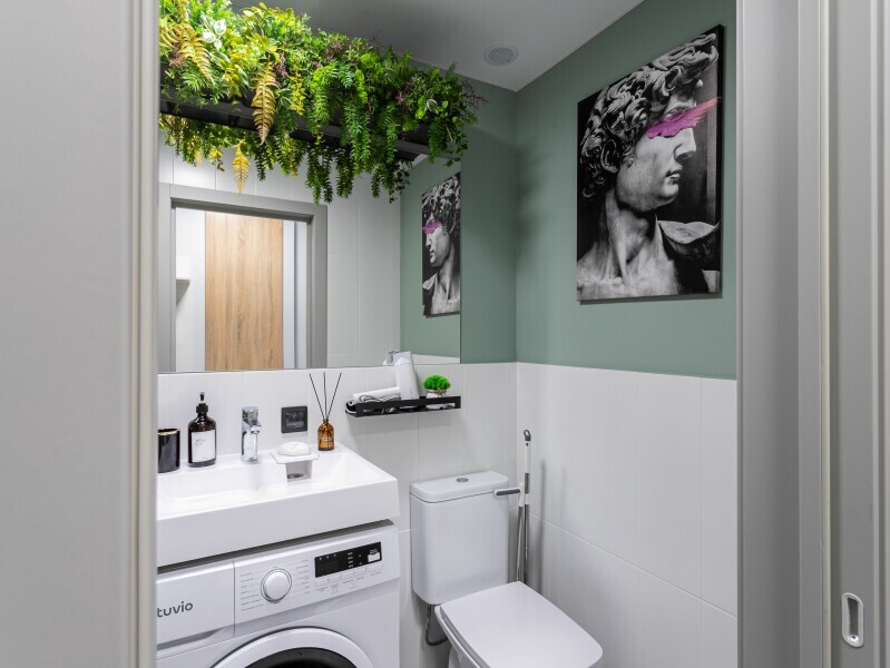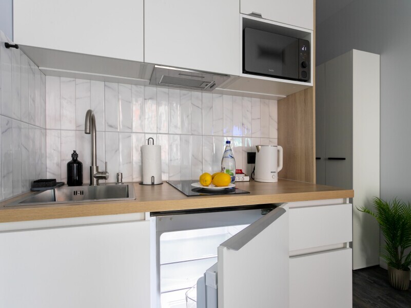 - Кухня (плита, холодильник, стиральная машина, сушилка, микроволновая печь, чайник, посуда, столовые приборы).