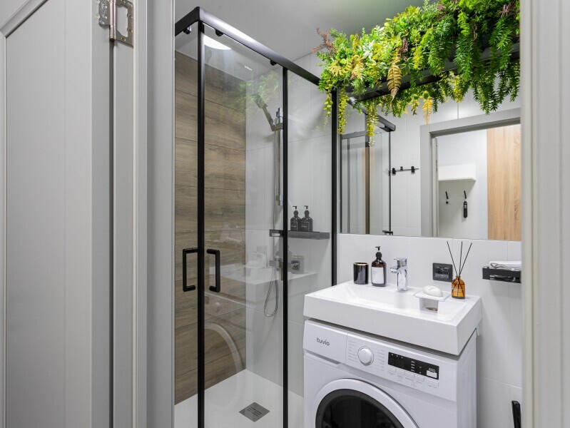 - Душевая кабина, необходимые бытовые приборы: фен, гладильная доска и утюг.