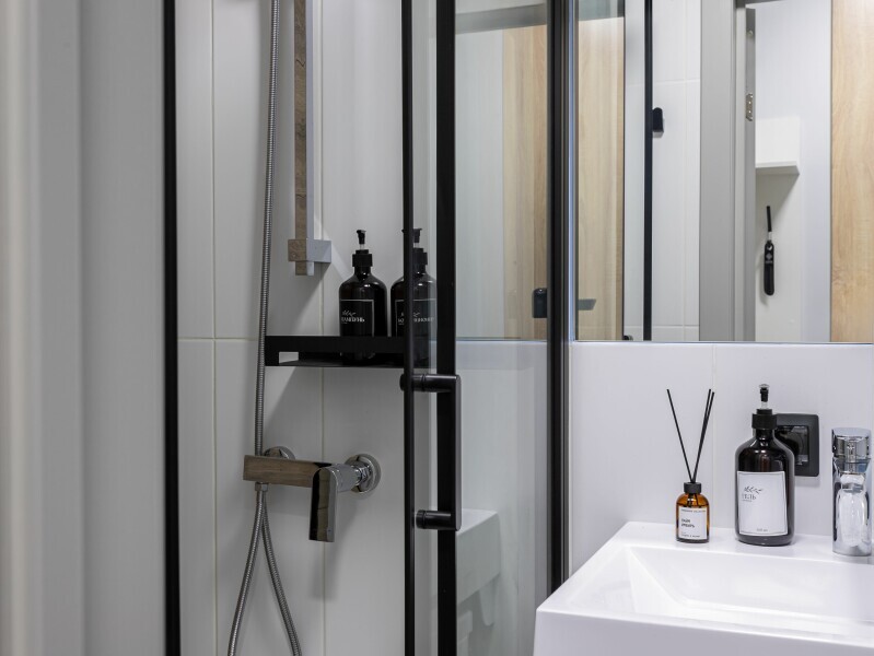 - Душевая кабина, необходимые бытовые приборы: фен, гладильная доска и утюг.