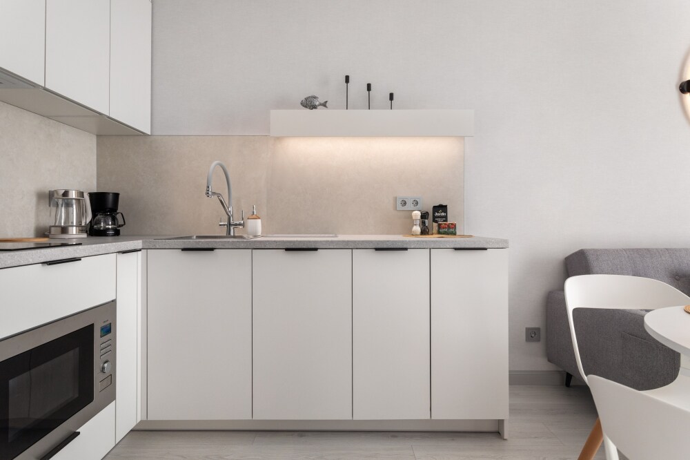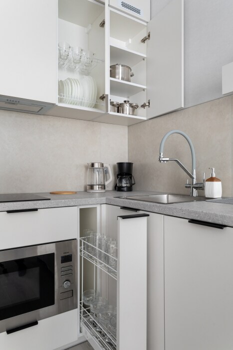 Кухня оснащена: холодильником, плитой, микроволновой печью, электрическим чайником.