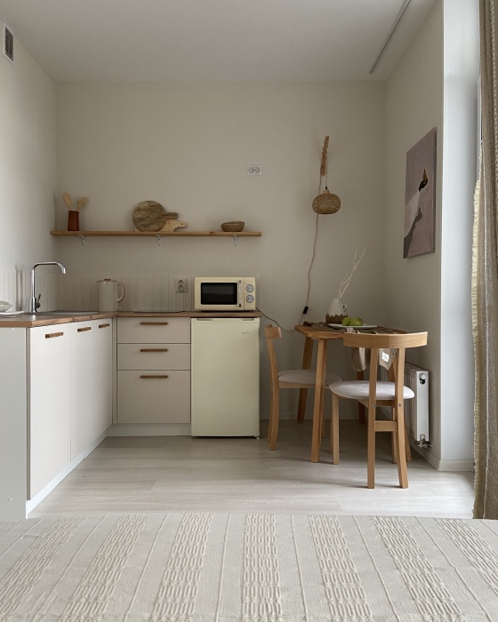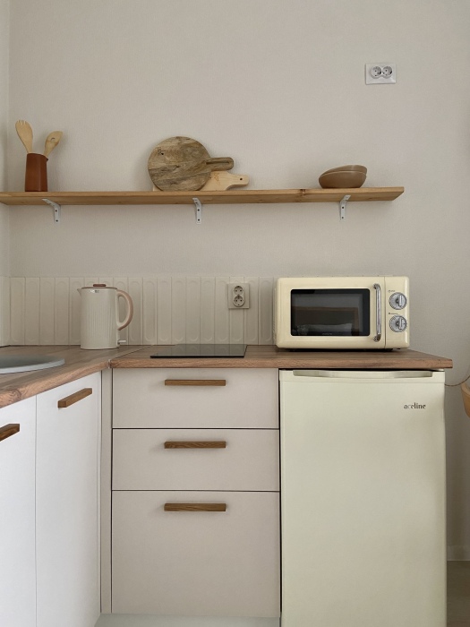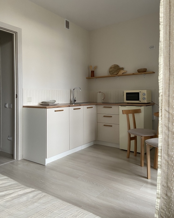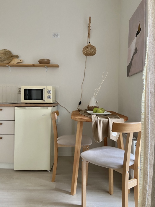 Завтрак в постель? Легко! Наша безупречно оборудованная кухня ждёт Вас. И главная звезда утра - ароматная кофеварка, которая приготовит для Вас бодрящий эспрессо или нежный капучино, чтобы начать день с идеальной чашки кофе.