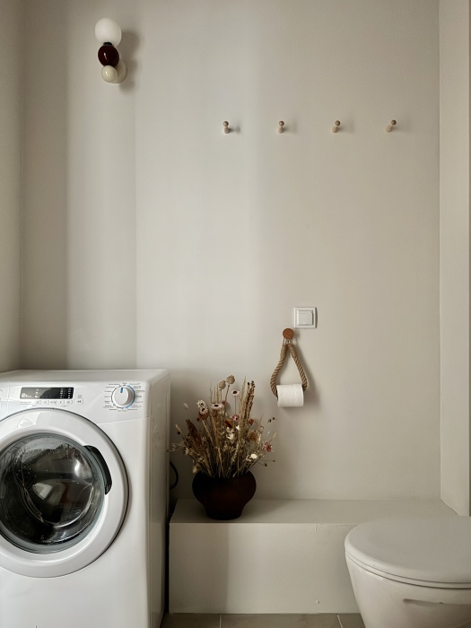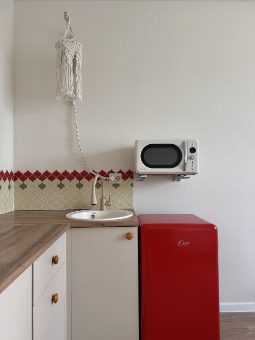 - Вся техника: плита, холодильник, микроволновка, электрочайник, стиральная машина, утюг, гладильная доска, сушилка.
