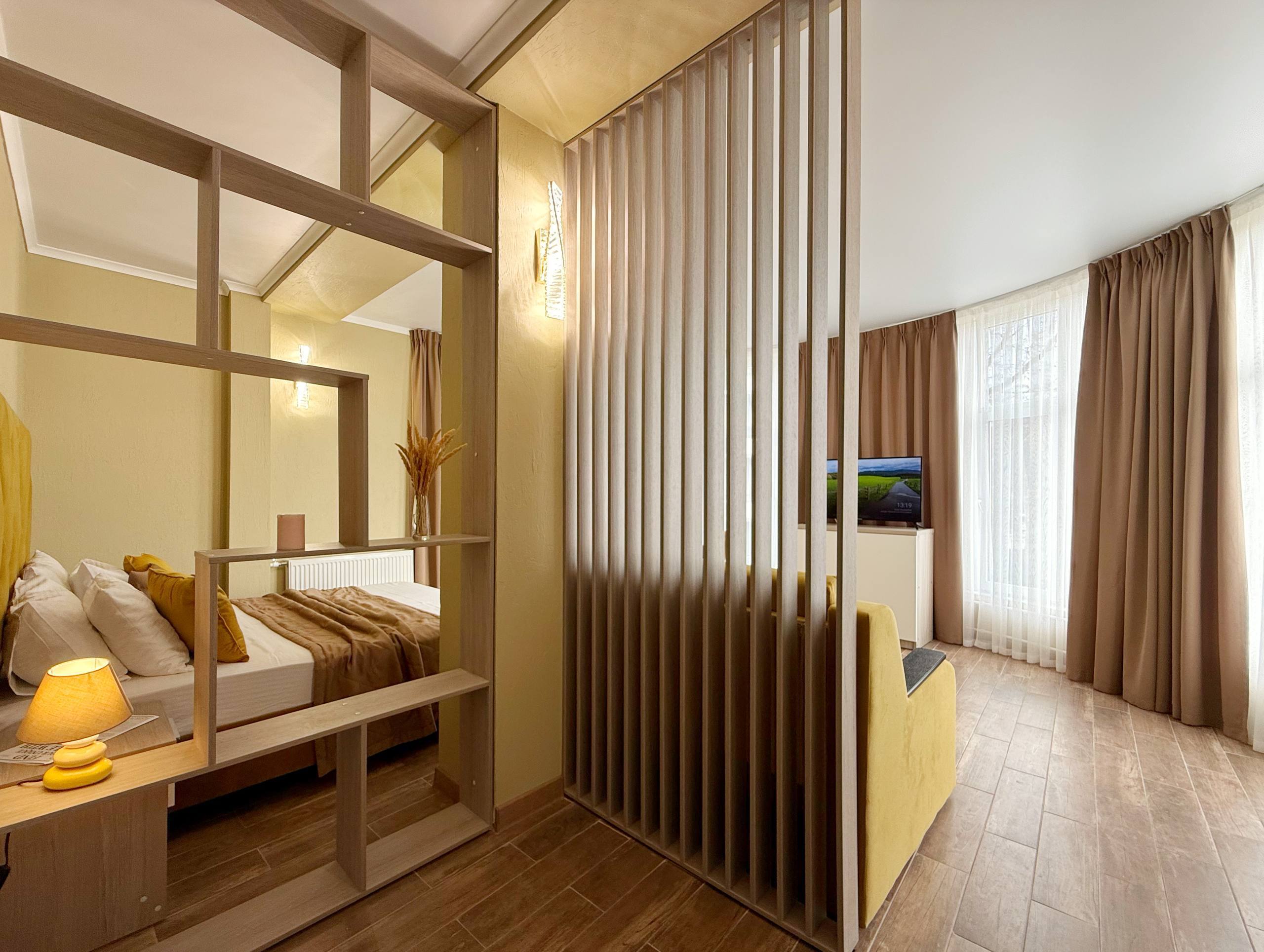Спальные места мечты! Основная двуспальная кровать с ортопедическим матрасом подарит Вам глубокий и здоровый сон, а удобный раскладной диван легко разместит двух дополнительных гостей. Все продумано для максимального комфорта Вашей компании или семьи!