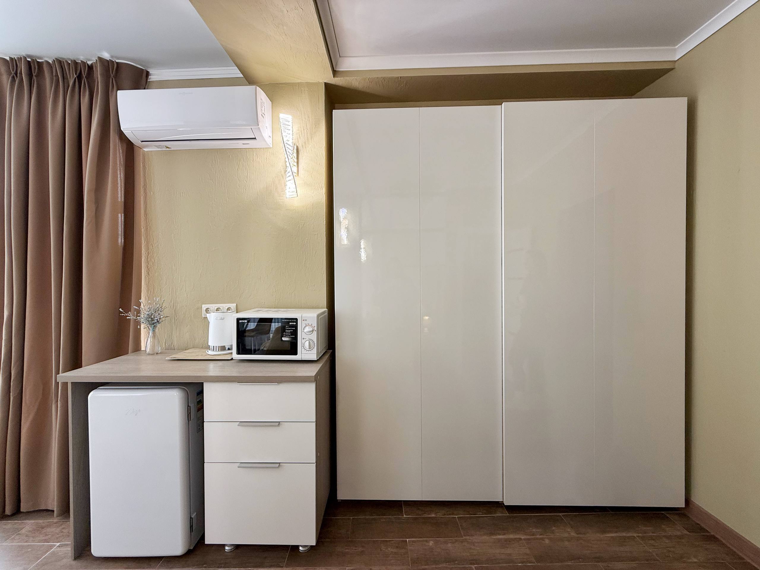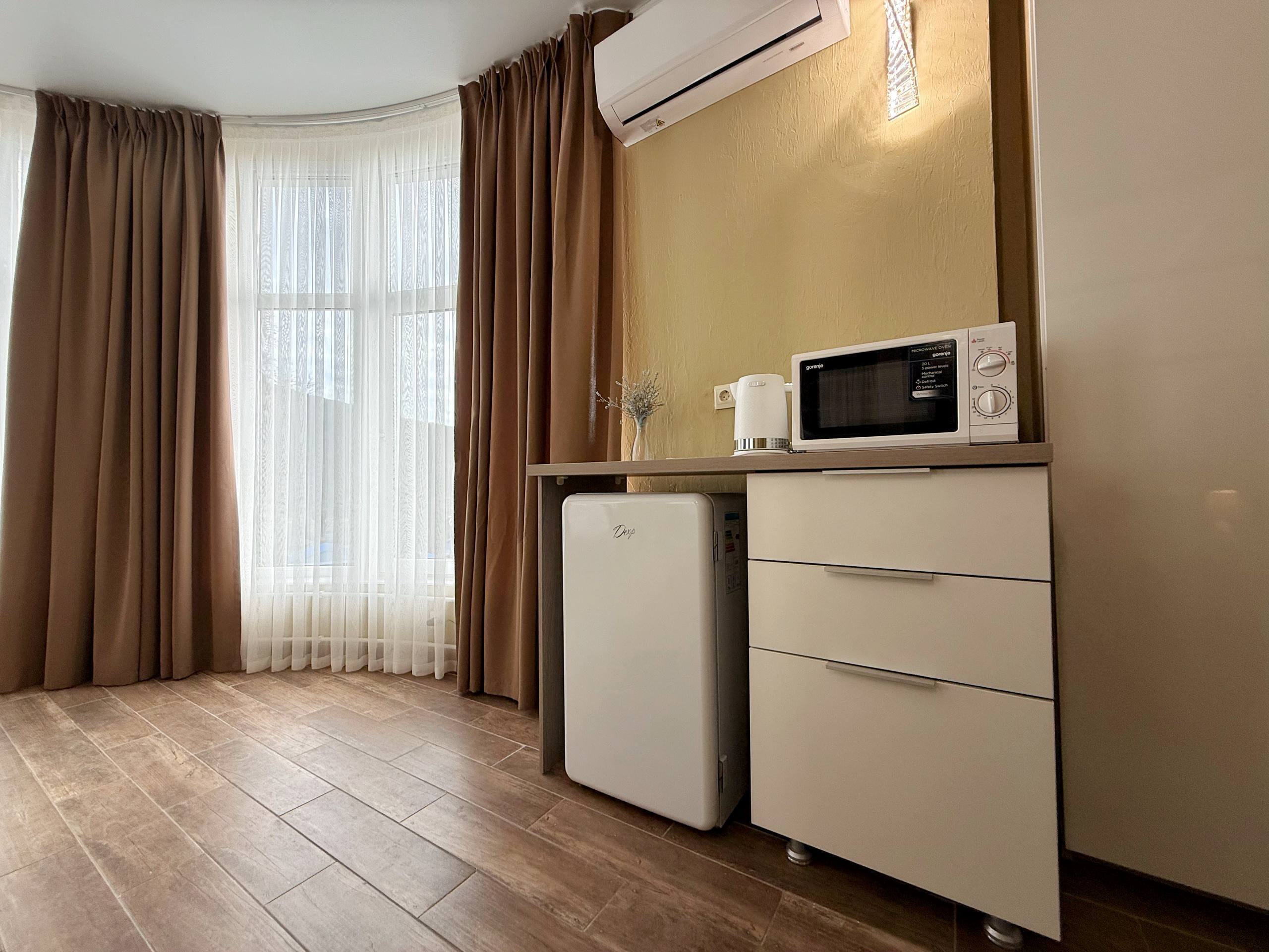 Современная кухонная зона - Ваш личный гастрономический уголок! Холодильник для свежих продуктов, микроволновая печь для быстрого разогрева, электрический чайник для утреннего кофе или вечернего чая - всё под рукой! А если захочется приготовить что-то особенное, на территории комплекса Вас ждет просторная общая кухня с полным набором посуды и техники.
