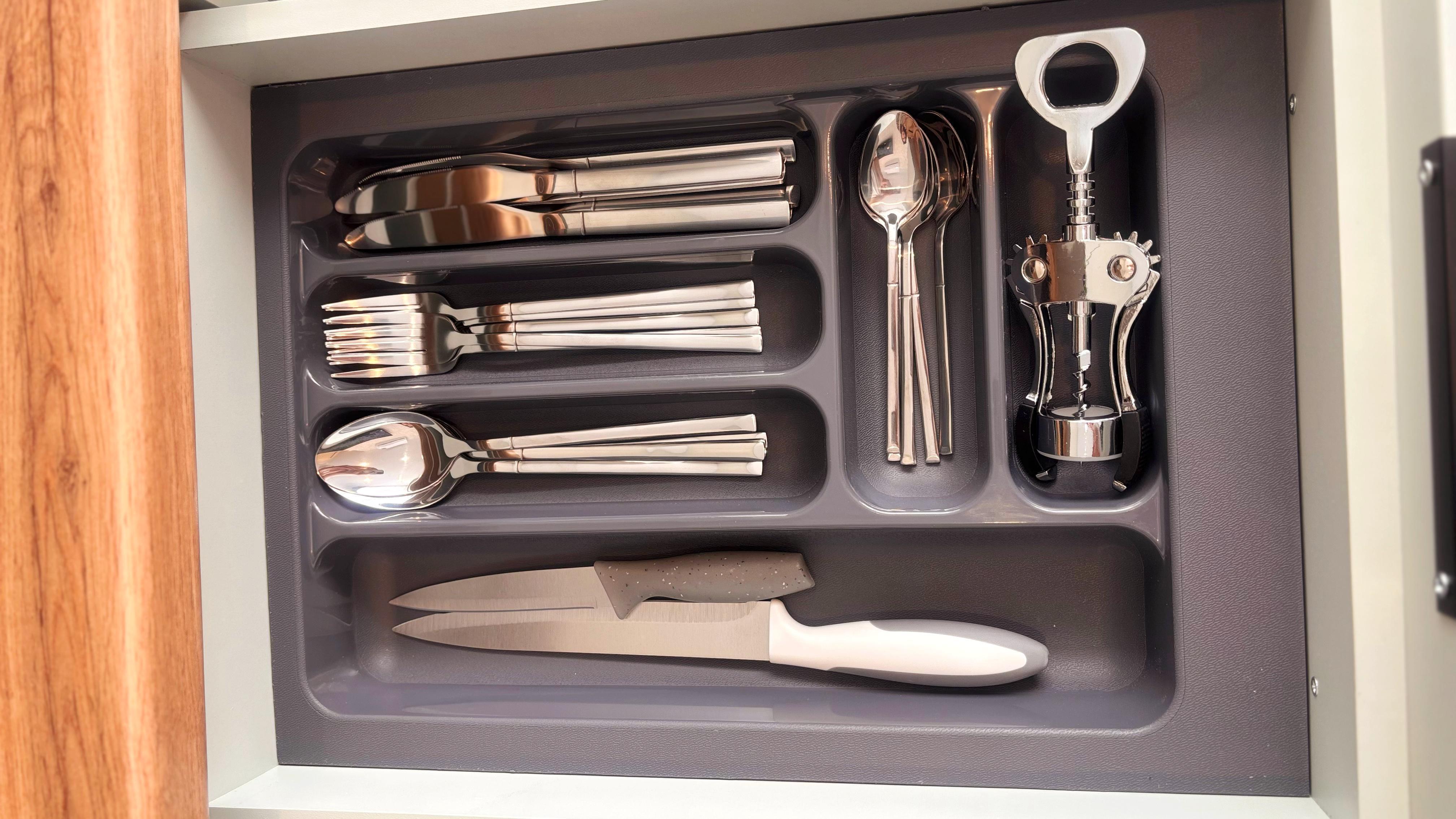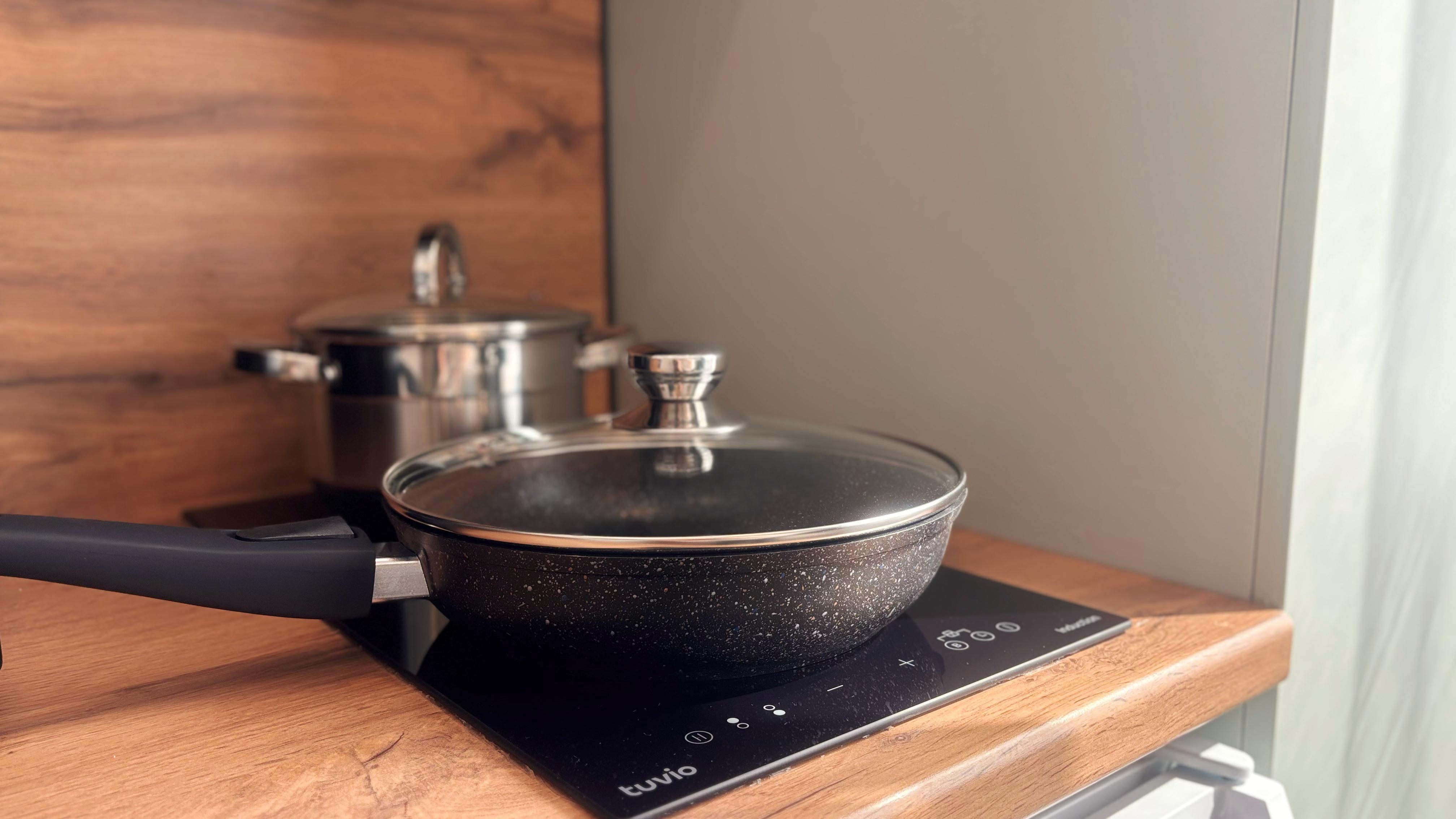 - Современная кухня с индукционной плитой, микроволновкой, чайником и набором посуды.
