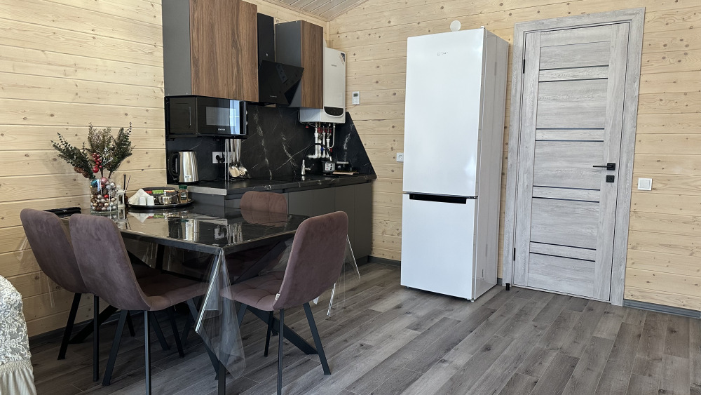 Кухня-гостиная укомплектована всей необходимой техникой и посудой (холодильник,