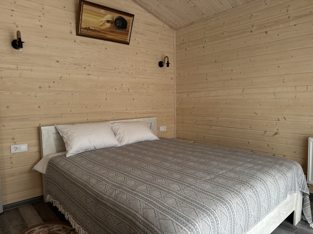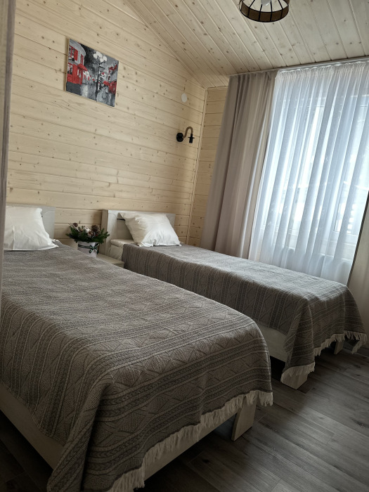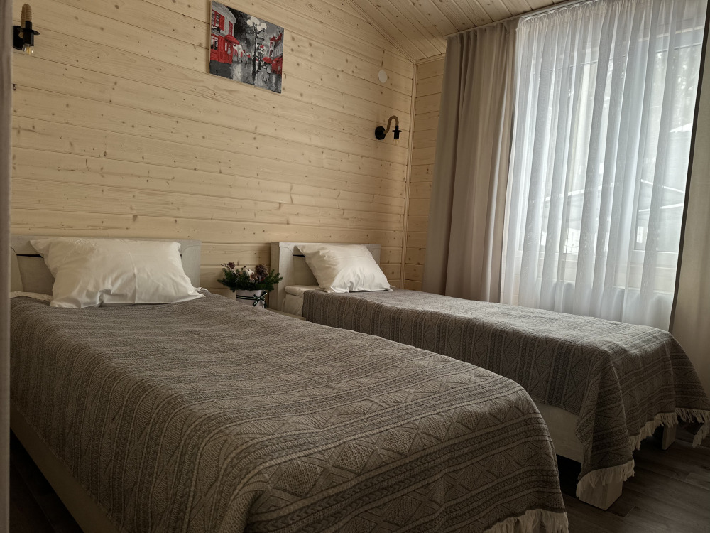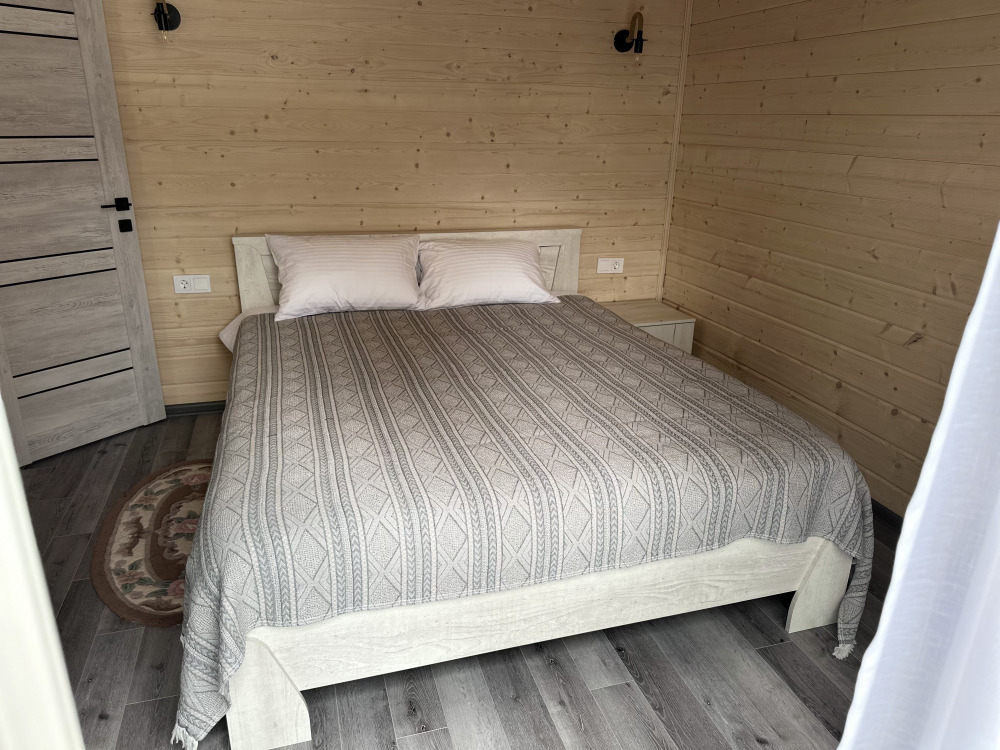 Первая спальня с двуспальной кроватью. Вторая спальня с двумя односпальными кроватями. Совмещённый санузел. У домика своя терраса с садовой мебелью и мангальной зоной.