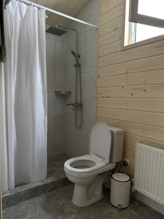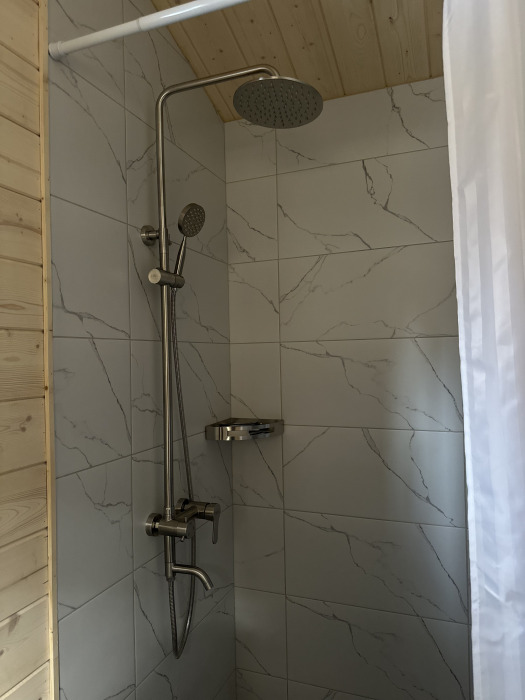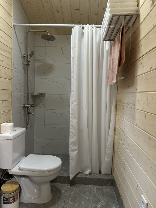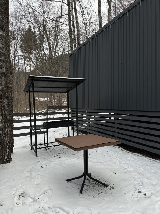 Совмещённый санузел. У домика своя терраса с садовой мебелью и мангальной зоной.