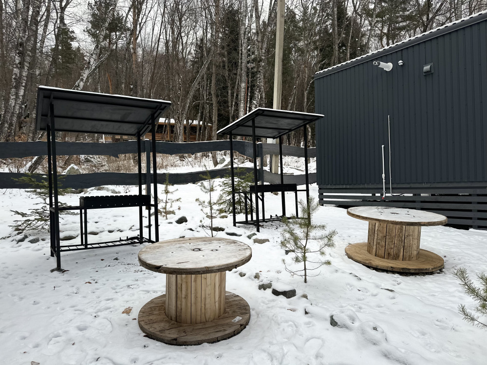 У каждого домика своя терраса с садовой мебелью и мангальной зоной.