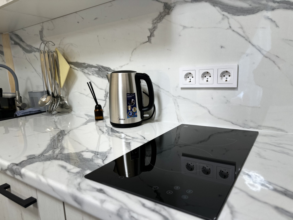 варочная панель, микроволновая печь, вытяжка, чайник), двуспальный диван, телевизор.