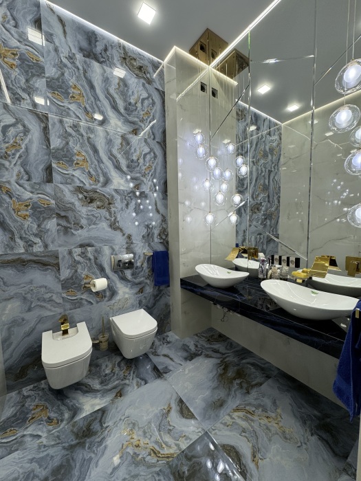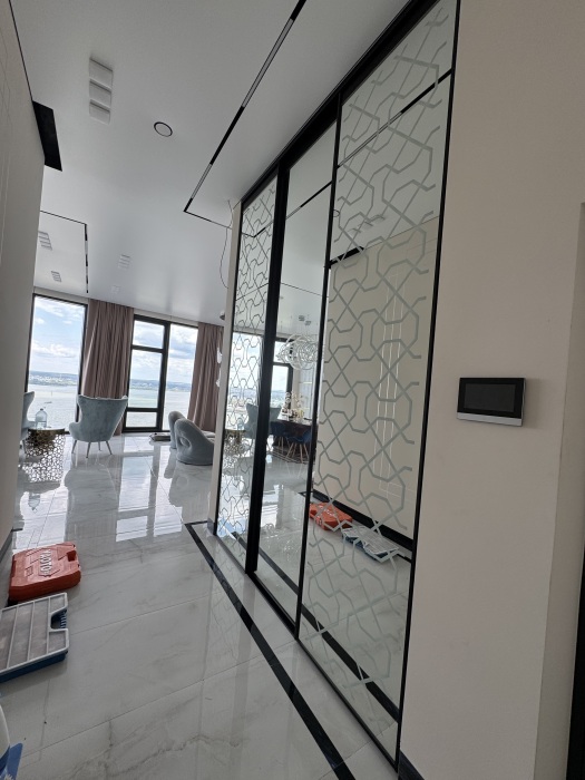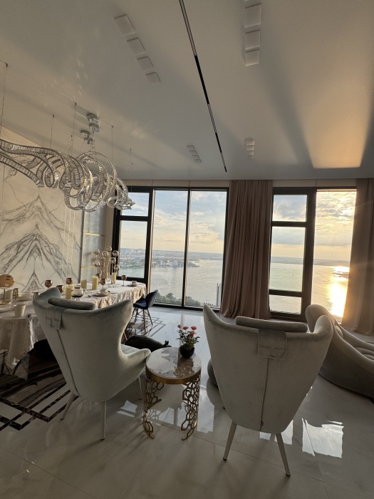 В пентхаусе: Зал 60м2 с центральным видом на Ижевский пруд, набережную; Кухонная зона; Большой обеденный стол за сервированный и украшенный; 2 роскошные люстры и роспись под мрамор, а так же перламутровая отделка под крокодила украшают зал.