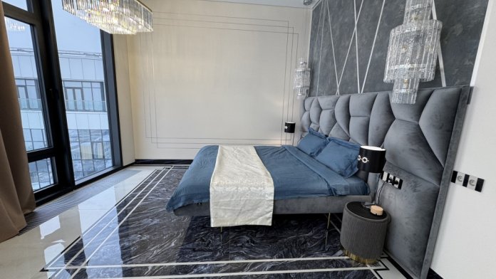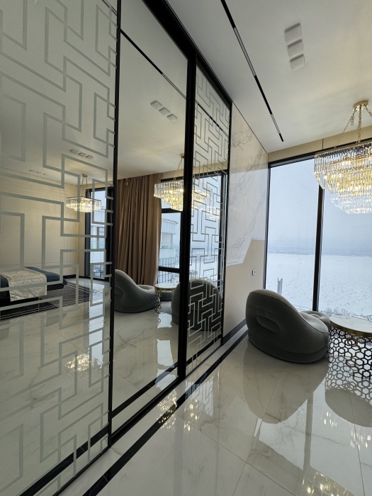 Номер 33м2, окна в пол, высокие потолки, хрустальные люстры, широкая двуспальная кровать, собственный встроенный шифоньер, прикроватные тумбы, торшеры, удобные кресла и журнальный столик, зажечь свечу или посидеть с чашечкой чая.