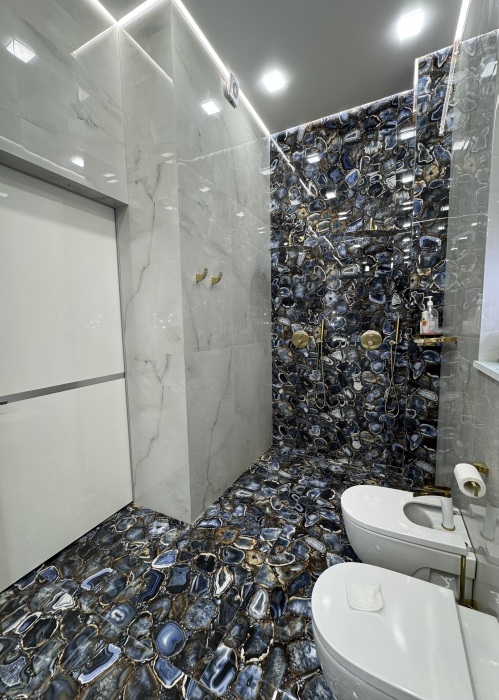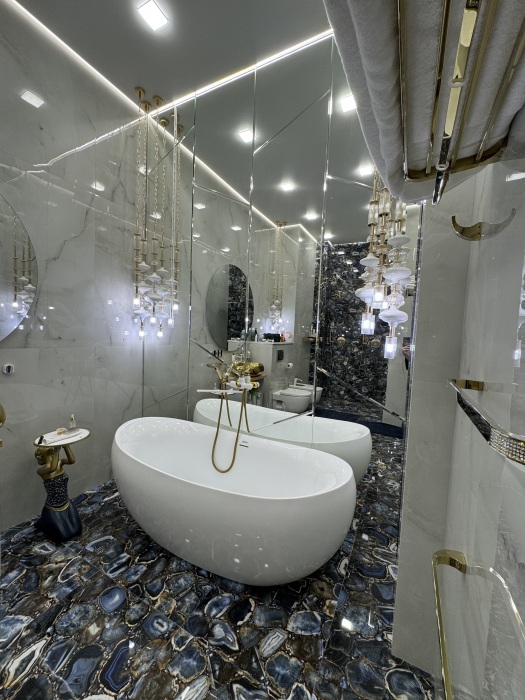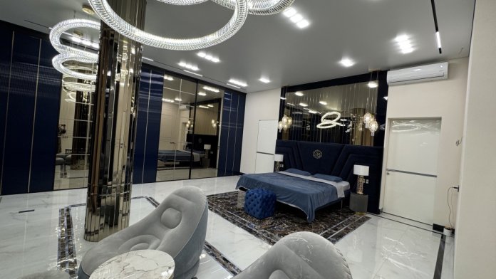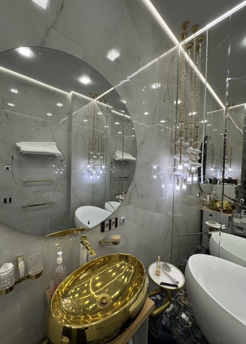 Весь номер 60м2 с собственным санузлом, где есть 2 душа, ванная, раковина, унитаз, биде) + небольшая угловая комната (6м2), окна в пол, высокие потолки ,хрустальные люстры, широкая двуспальная кровать, собственный встроенный шифоньер, прикроватные тумбы, торшеры, удобные кресла и журнальный столик, зажечь свечу или посидеть с чашечкой чая.