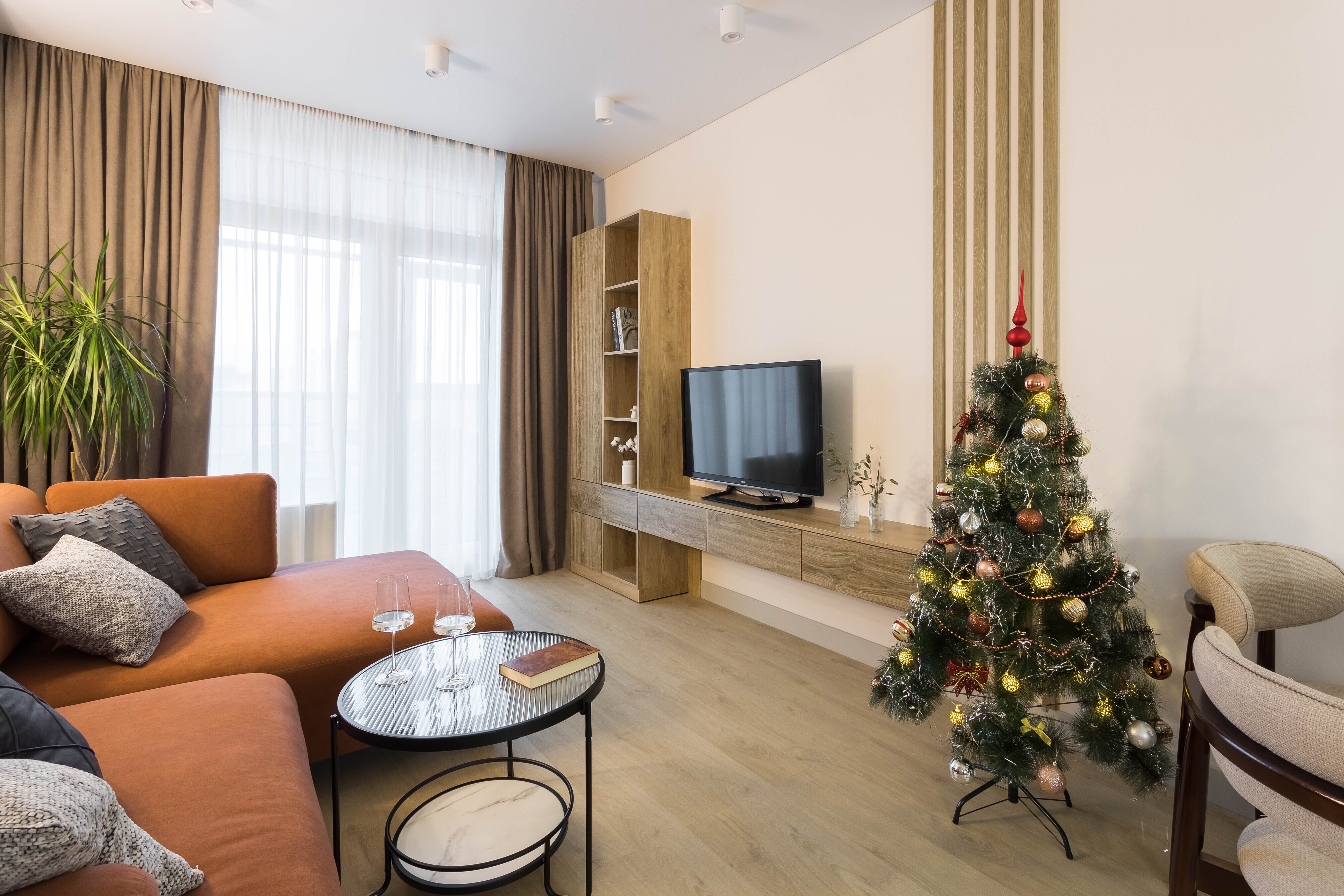 Уникальный каминный зал. Настоящая душа этой квартиры. Мягкий свет электронного камина создаёт неповторимую атмосферу для романтического вечера или душевных разговоров. Здесь же раскладывающийся диван и кресло-кровать для дополнительных гостей.