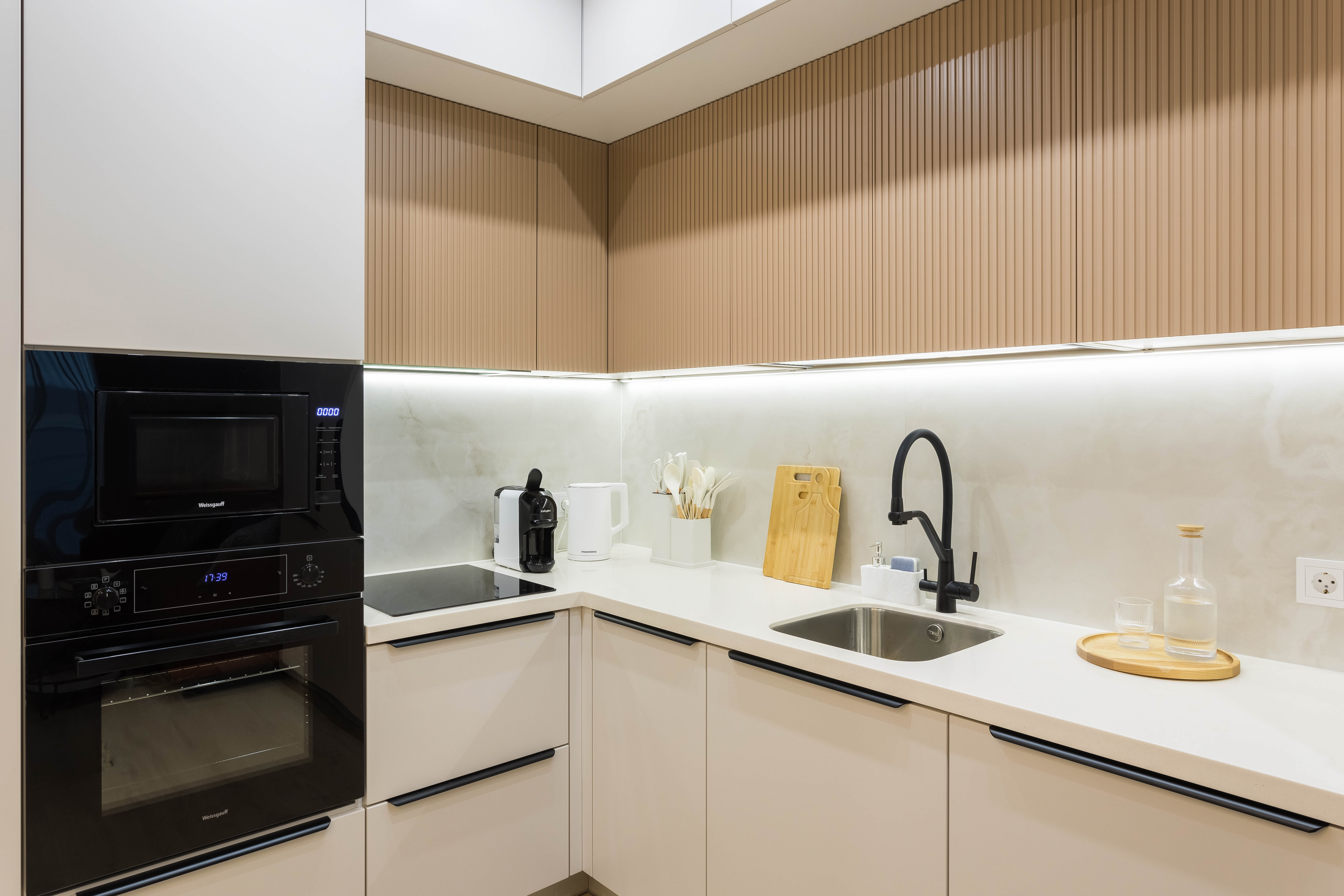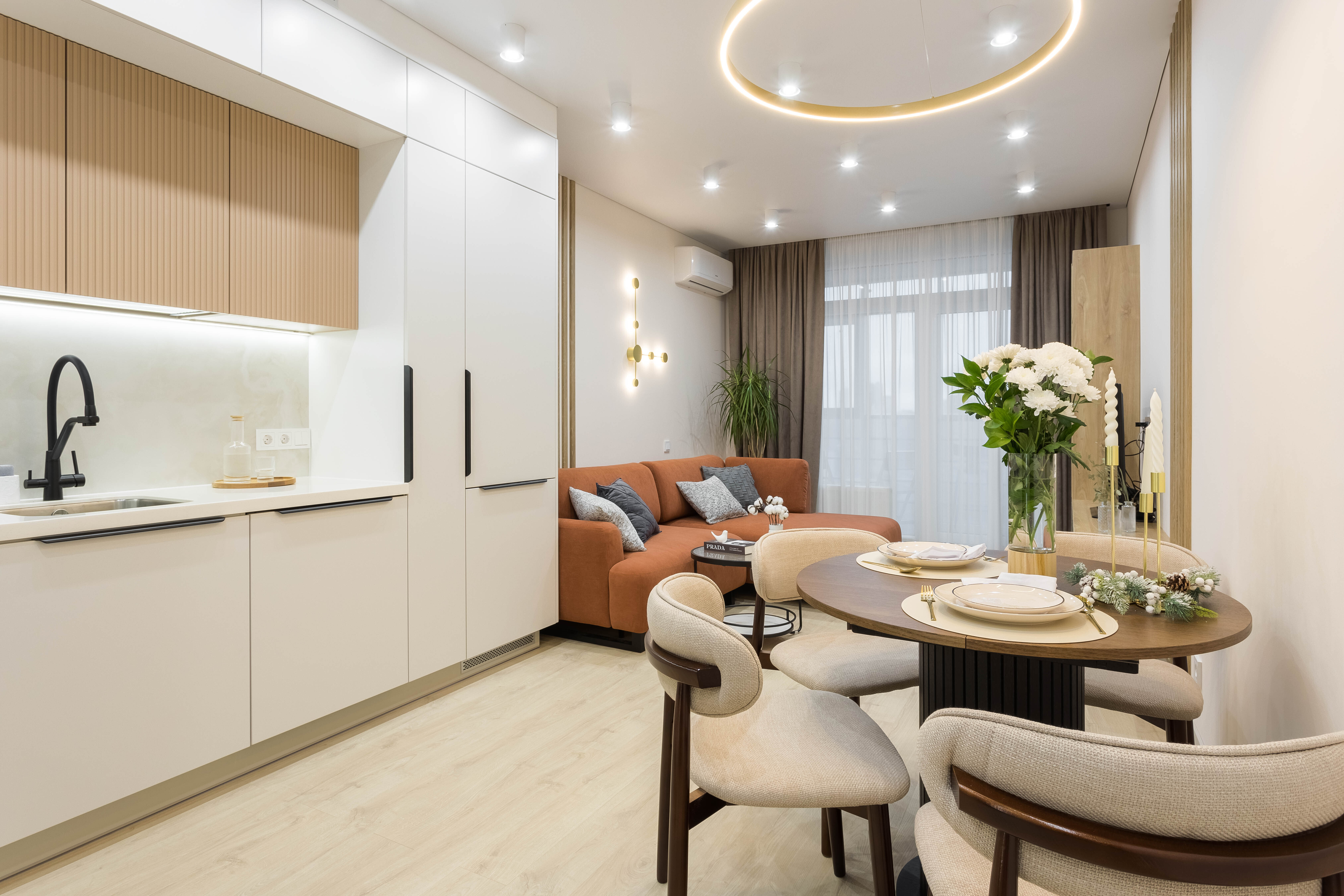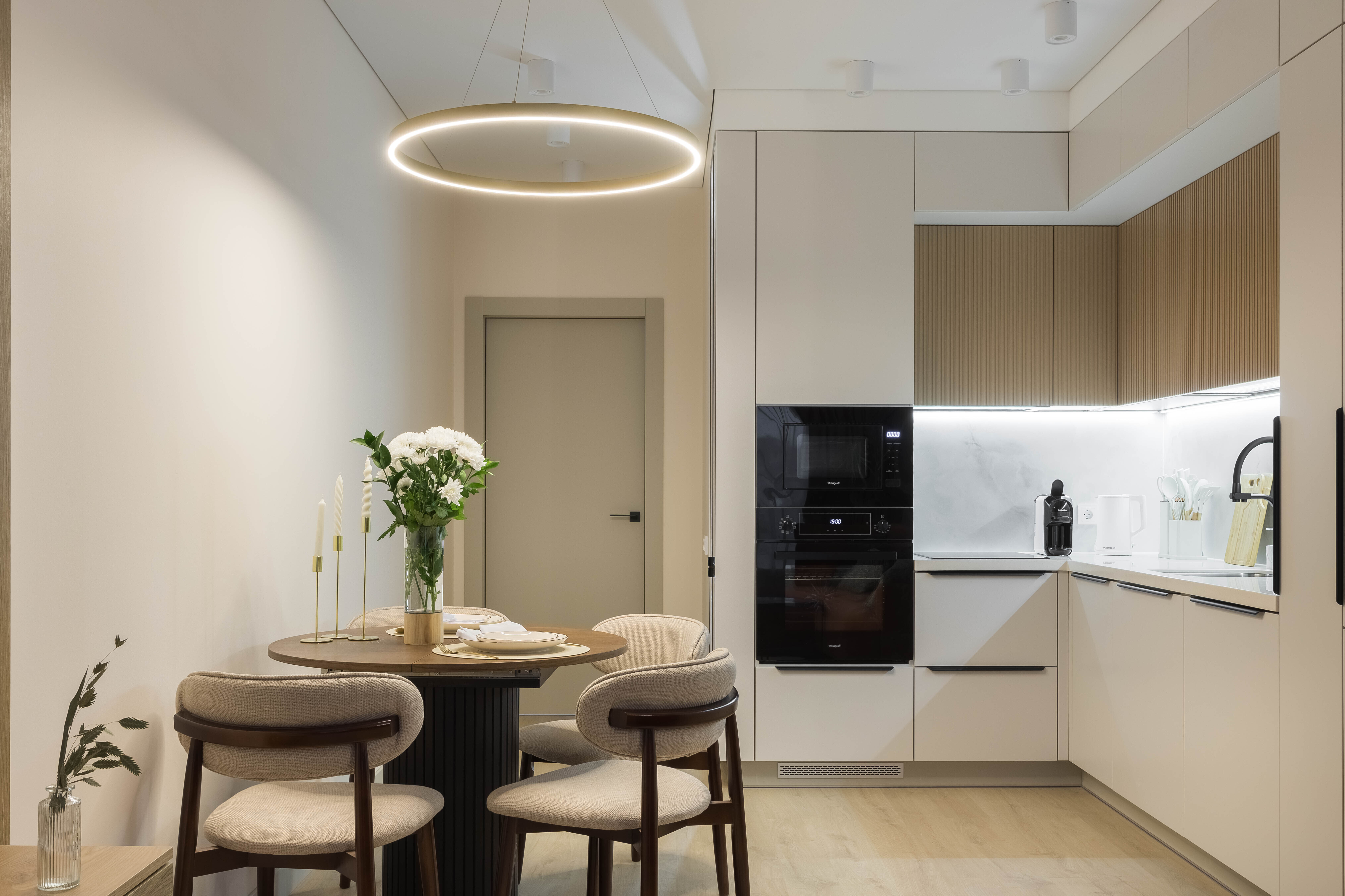 Сердце дома — кухня-гостиная. Просторная, светлая, оснащённая всем необходимым для жизни и праздника. Ужин у окна, приготовленный в духовом шкафу, будет сервирован на красивой посуде. Капельная кофемашина с чаем ждёт вас каждое утро. А после трапезы просто загрузите всё в посудомоечную машину и наслаждайтесь отдыхом на удобном раскладном диване.
