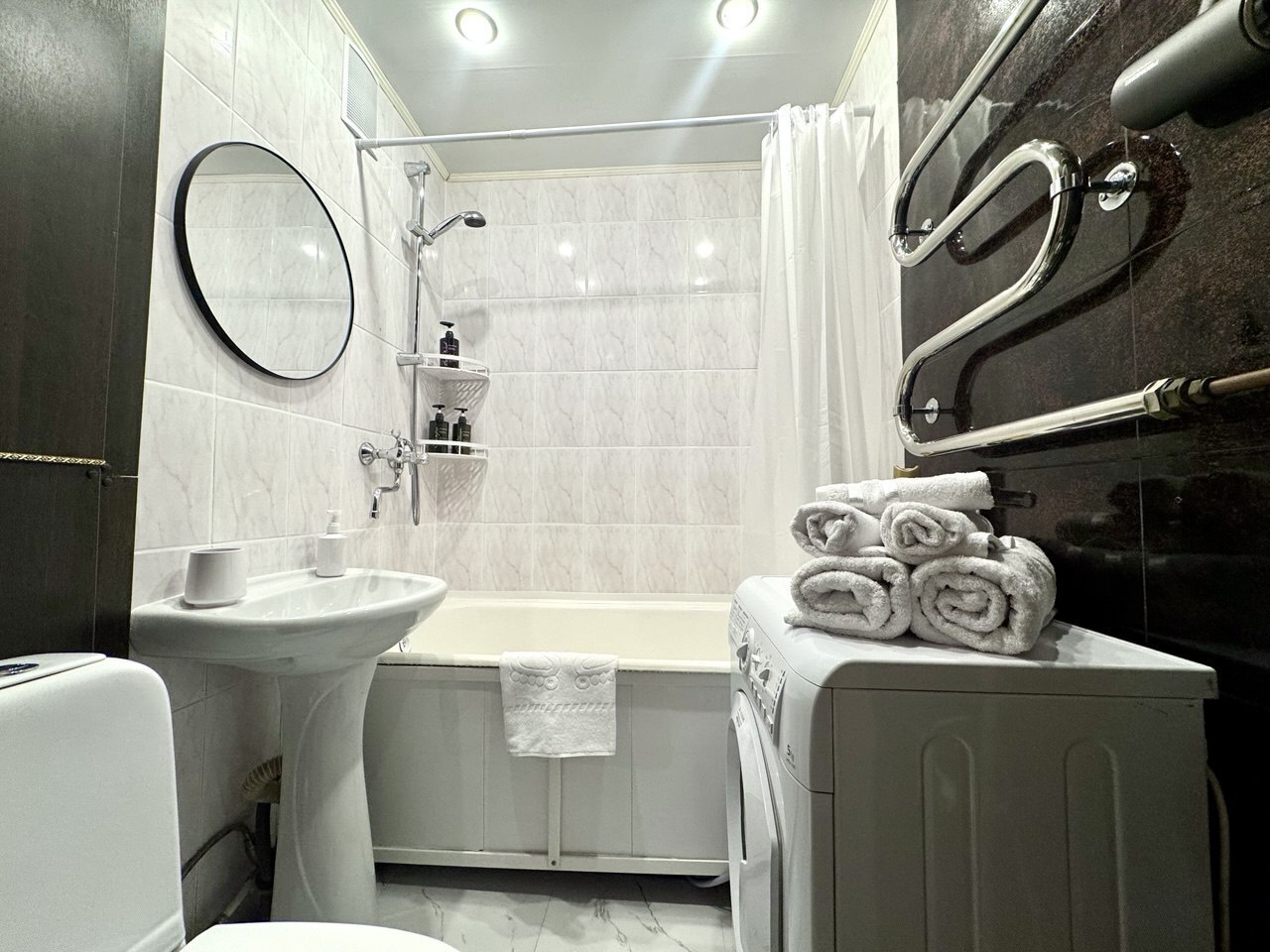 Чистая и функциональная ванная: начните день с комфорта! Примите ванну, Вас уже ждут пушистые белые полотенца, базовые предметы гигиены, фен и незаменимая стиральная машинка.