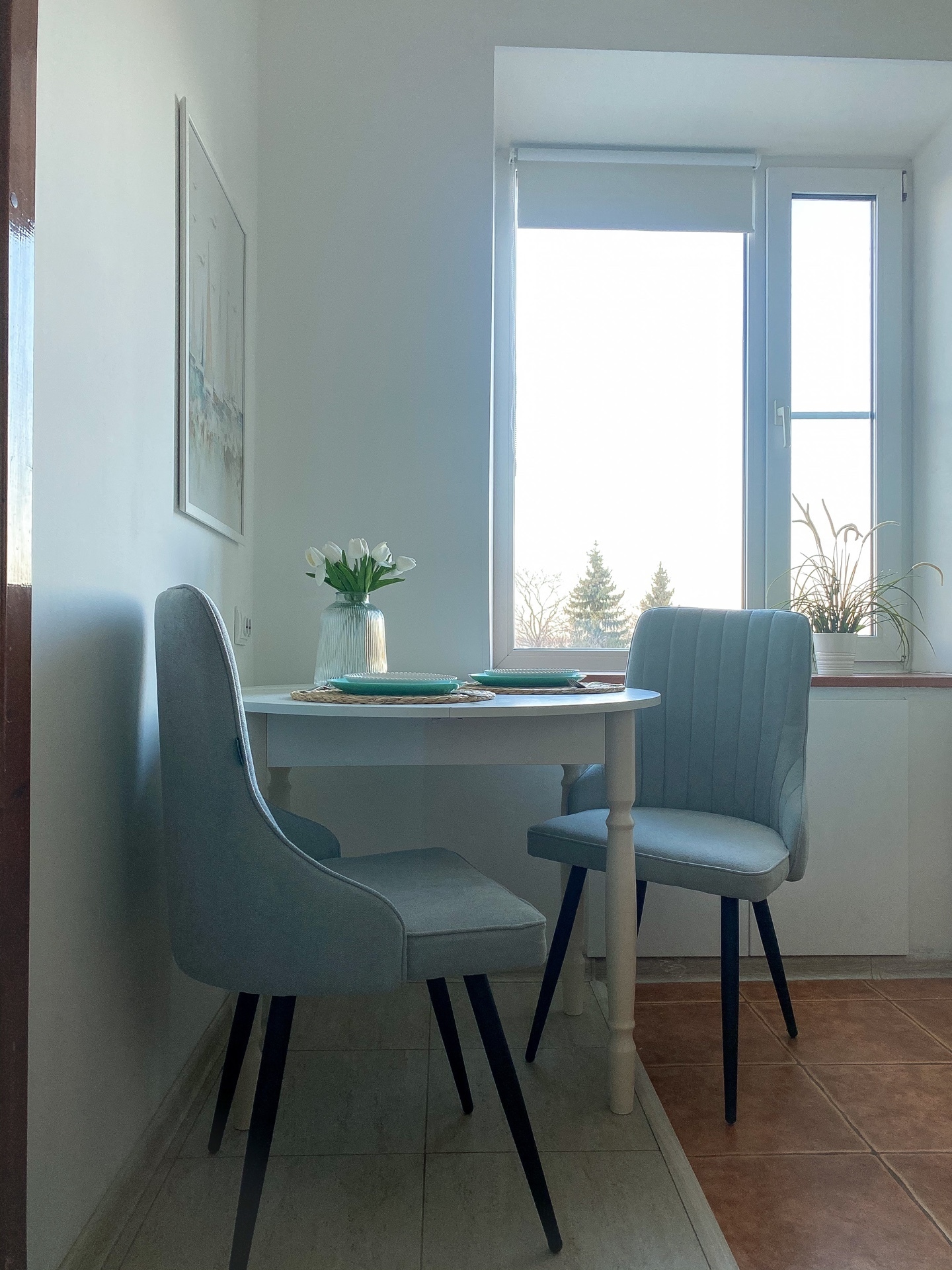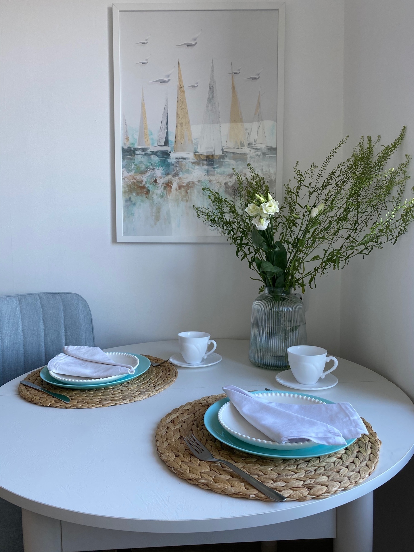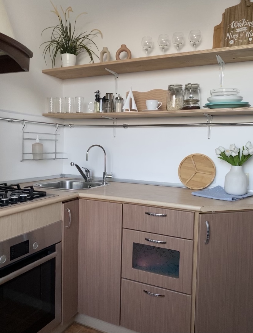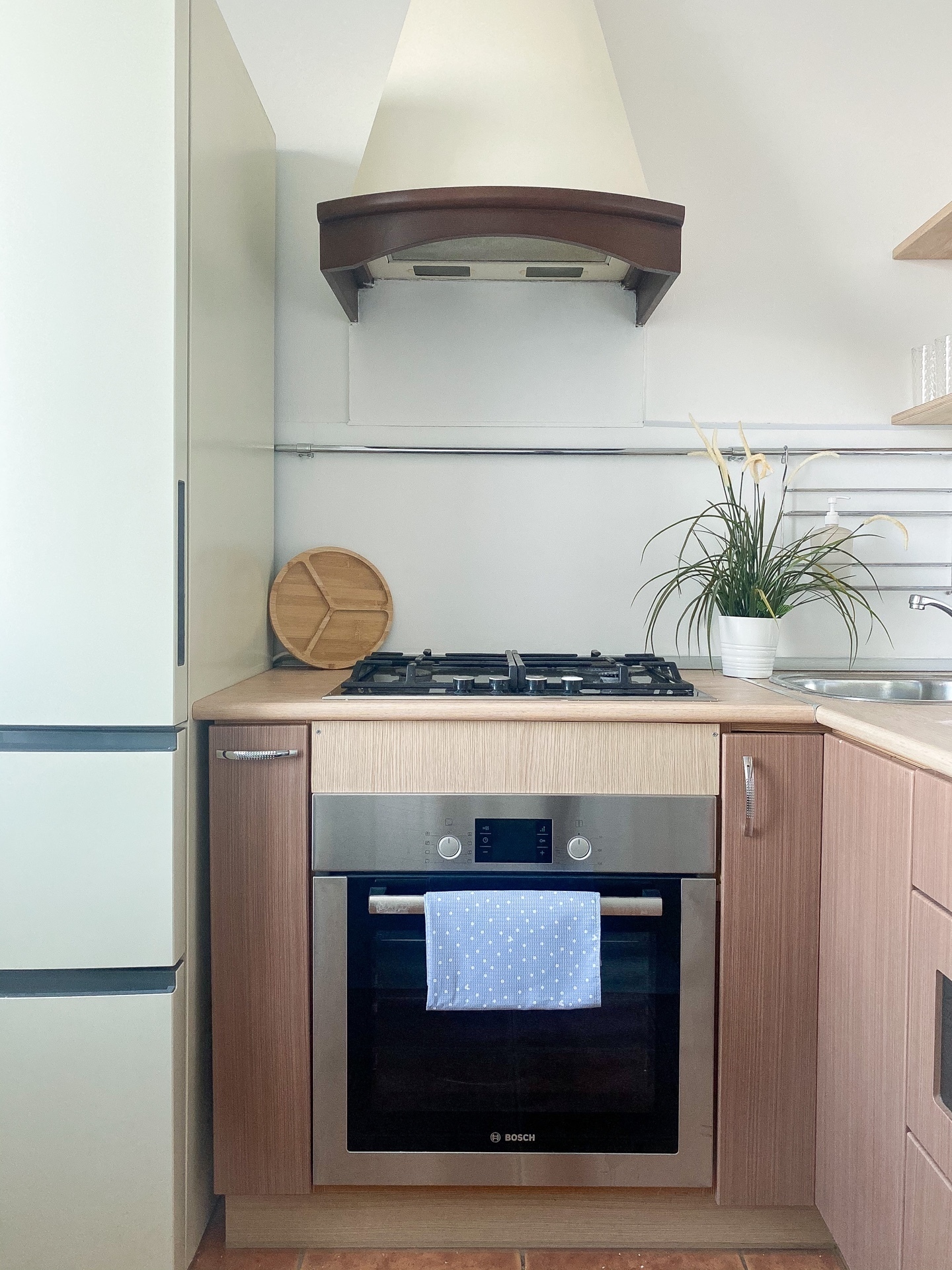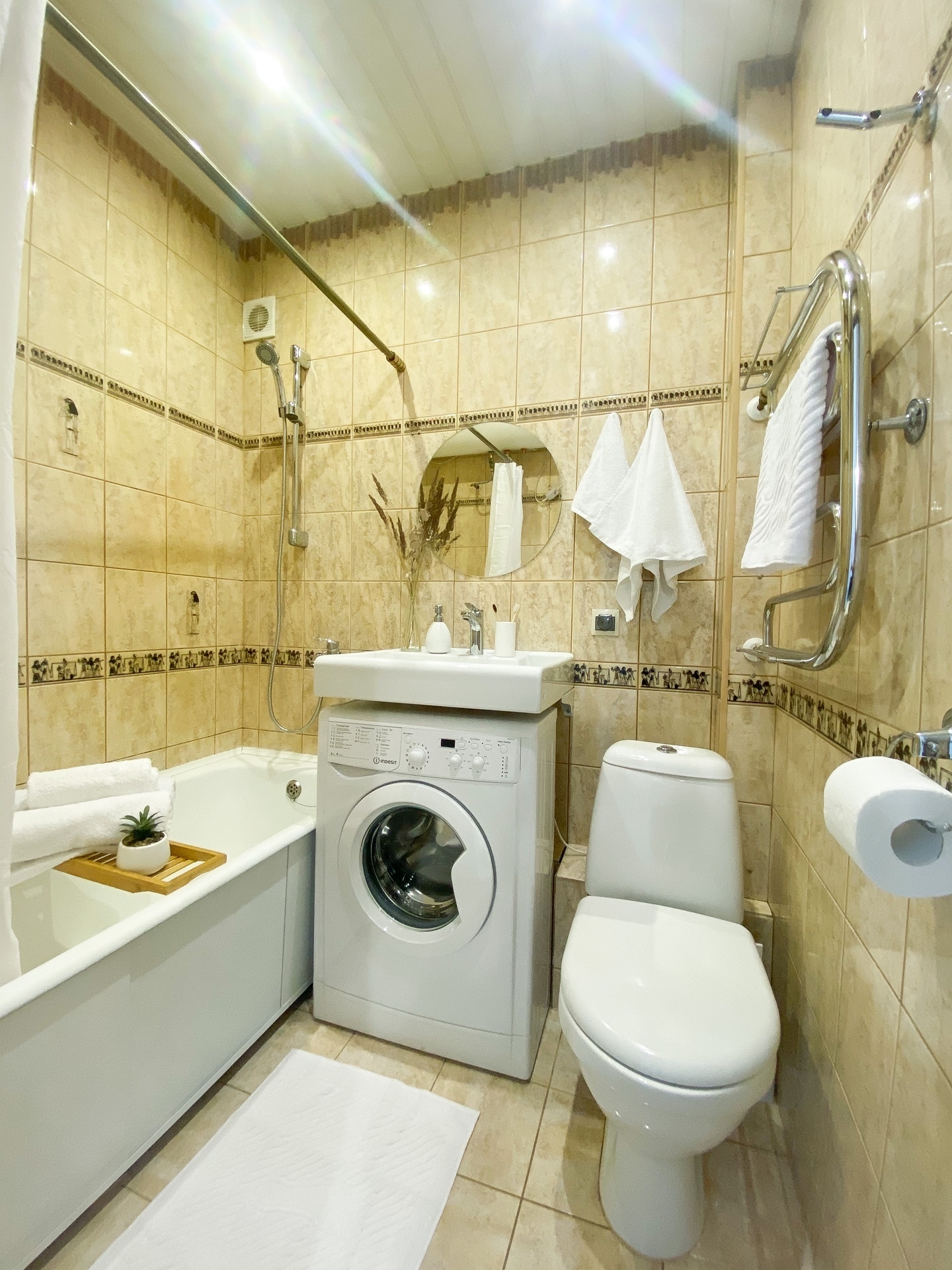 Для комфортного проживания есть рабочее место, большой шкаф для хранения. Гладильная доска, утюг, сушилка, фен, стиральная машина, чайник, микроволновка, духовка, плита и холодильник.