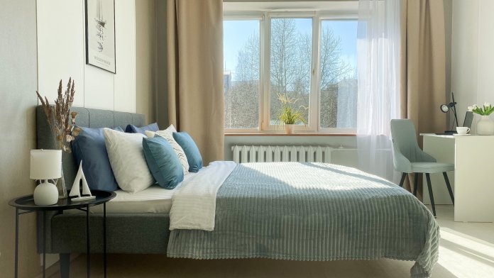 В светлой спальне кровать Кing-sizе, воздушным как облачко матрасом.