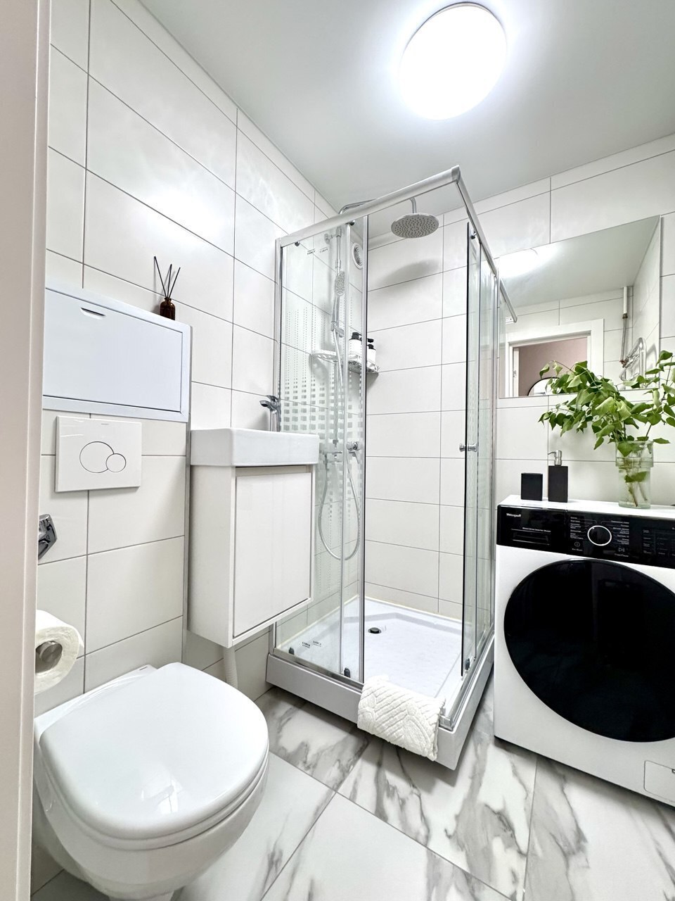 В ванной комнате Вас ждут гигиенический душ, белые полотенца, душевая кабина, фен и стиральная машина - всё для Вашего комфорта и гигиены.