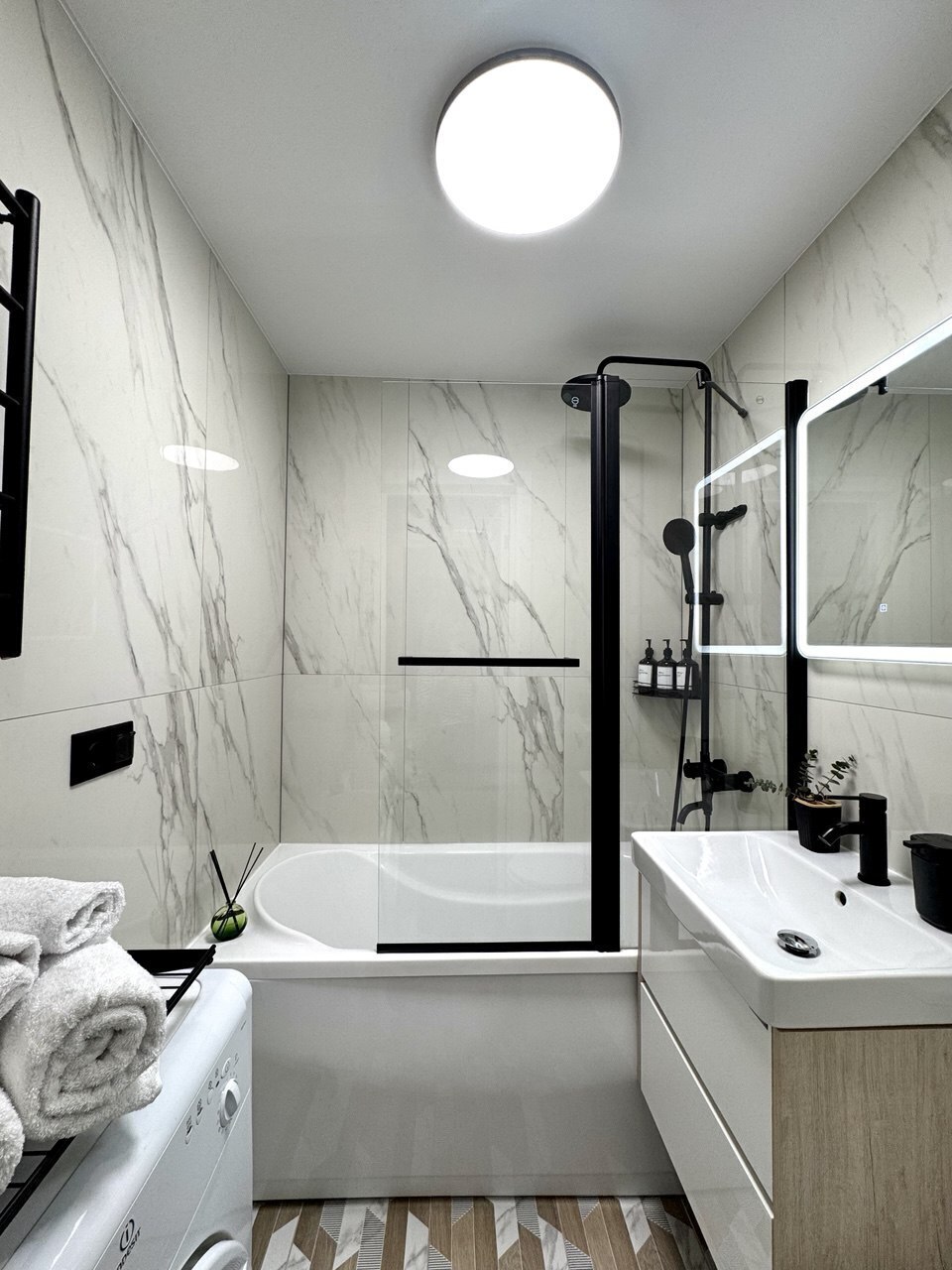 В ванной комнате Вас ожидает расслабляющая ванна, белоснежные пушистые полотенца и все необходимые предметы гигиены. Мы уже позаботились о мелочах, чтобы Вы могли сосредоточиться на отдыхе.