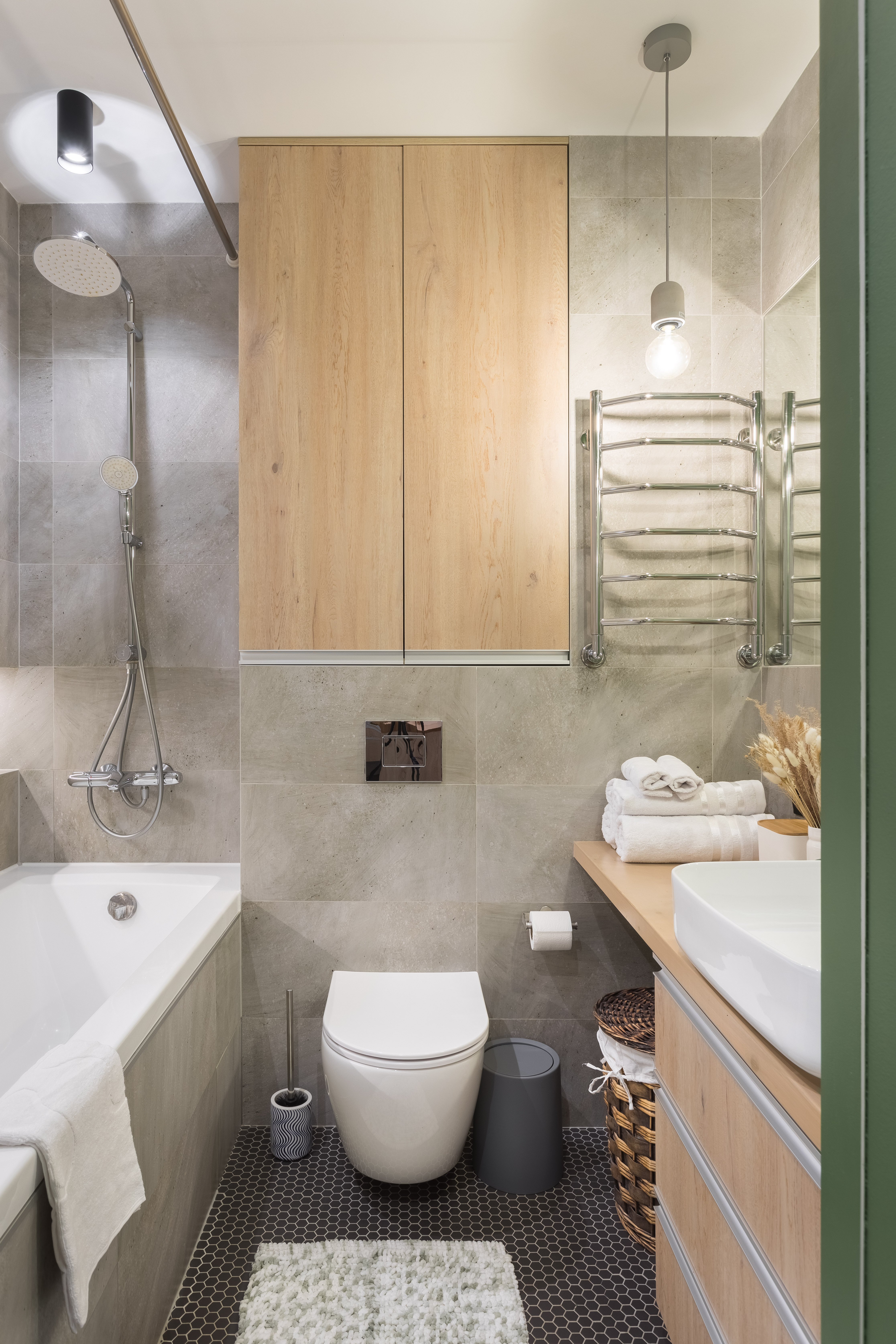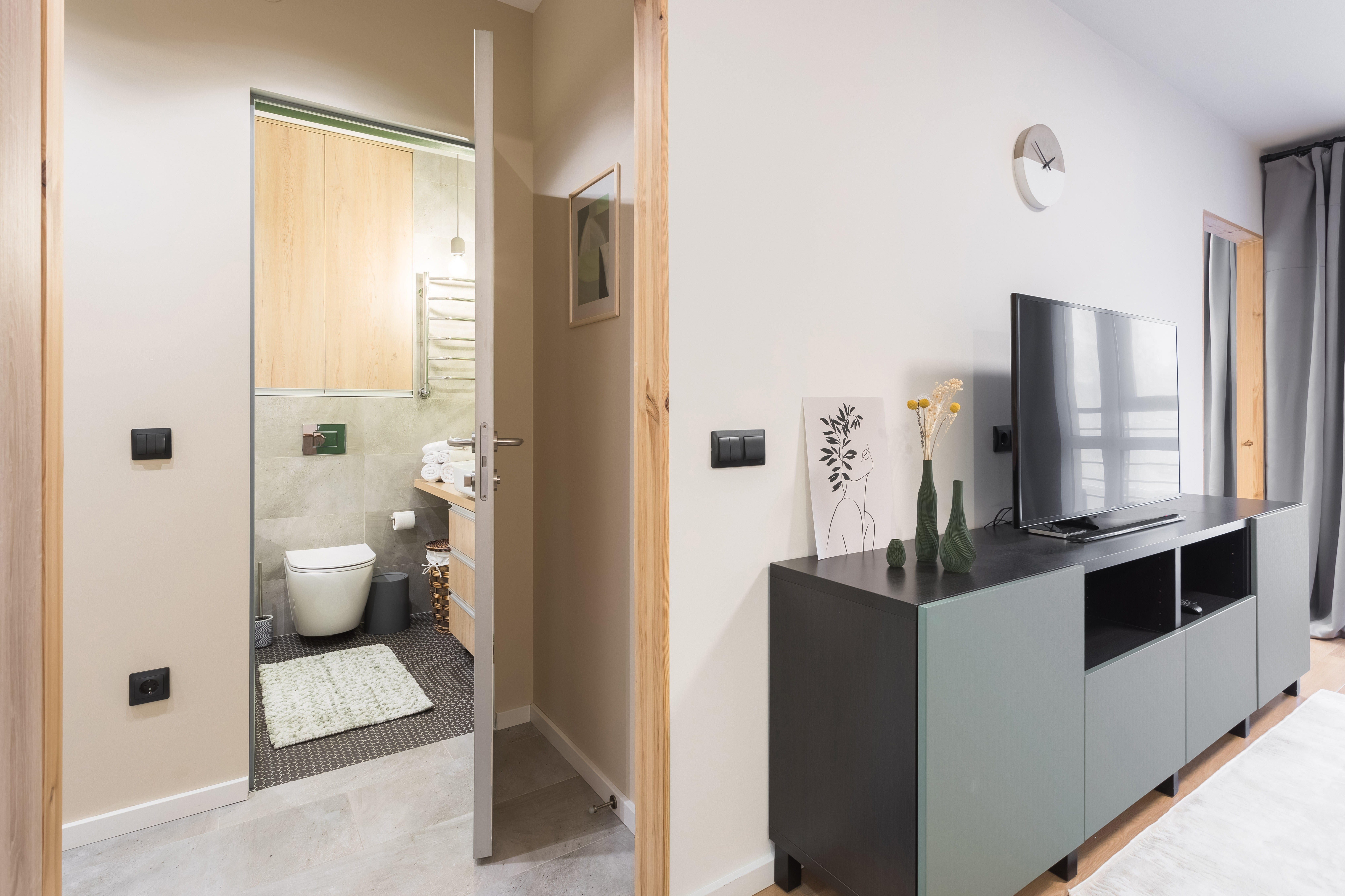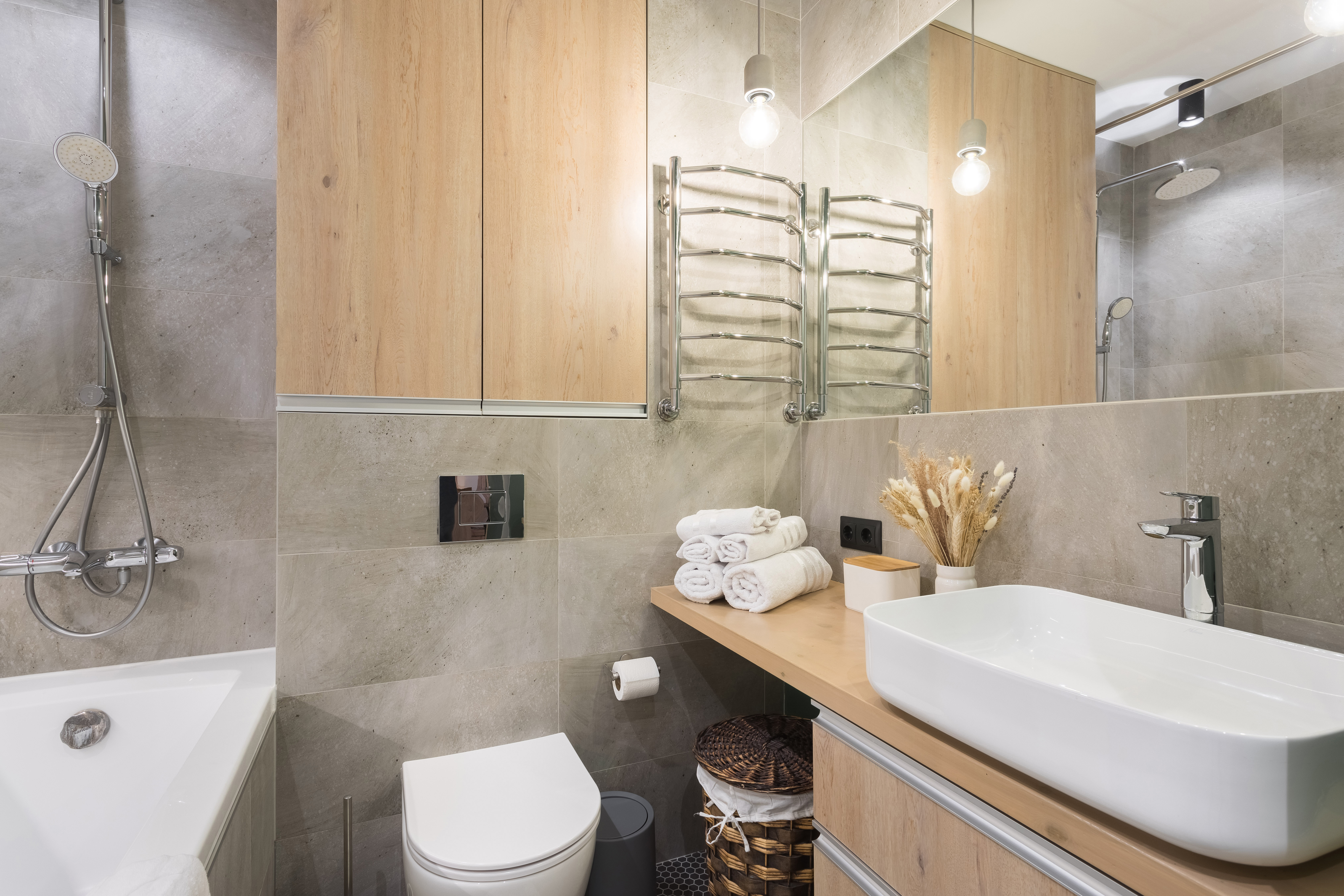 Чистая и функциональная ванная: начните день с комфорта! Примите ванну, Вас уже ждут пушистые белые полотенца, базовые предметы гигиены, фен и незаменимая стиральная машинка.