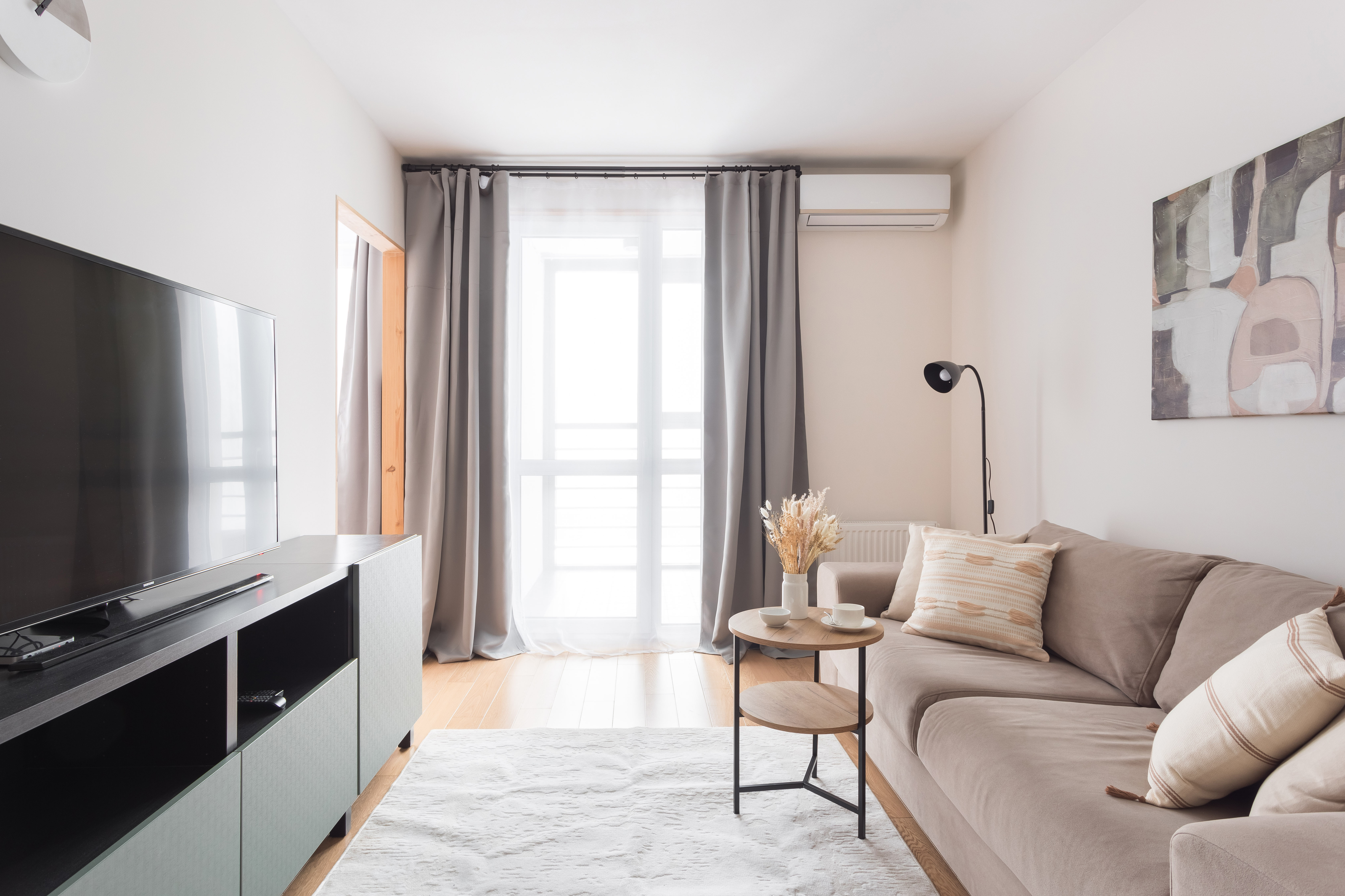Уютная спальня: погрузитесь в отдых на удобной кровати с белоснежным пастельным бельем. Рядом – зона отдыха с двумя мягкими креслами и телевизором – идеально для вечернего релакса или утреннего кофе.