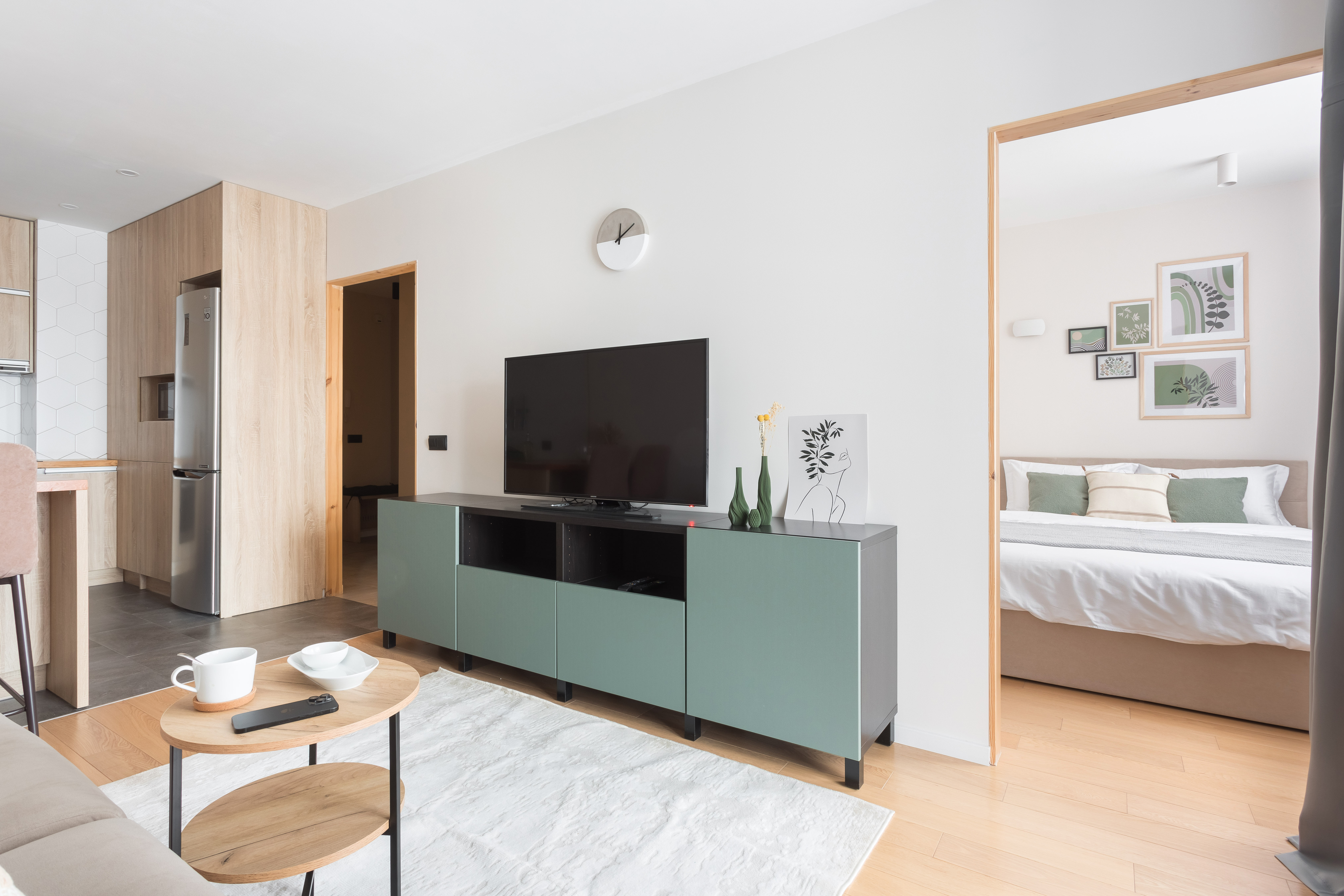 Отдельная кухня: все для кулинарных шедевров или быстрых перекусов! Полный набор посуды и столовых приборов, удобная обеденная зона, холодильник, чайник, микроволновка – готовьте с удовольствием.