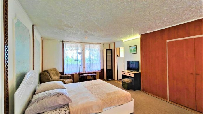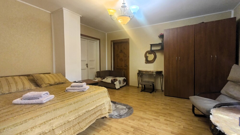 В качестве спальных мест — большая двуспальная кровать и удобный раскладной диван.