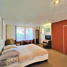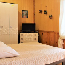 Номер оснащён двуспальной кроватью, шкафом-гардеробом, телевизором, мини-кухней, отдельной точкой доступа сети Wi-Fi. Есть возможность поставить дополнительное место (за доп. оплату).