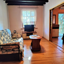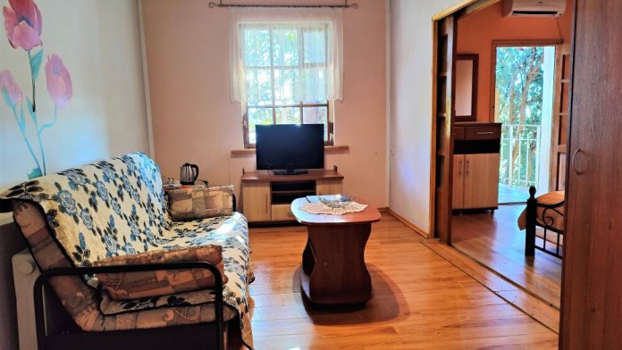 Располагает плазменным Smart TV, холодильником, кондиционером в обеих комнатах, электрочайником, микроволновой печью, Wi-Fi, комфортной мягкой и балконной мебелью. Санузел просторный. Номер востребован людьми, желающими спокойного отдыха, уединения и пользуется популярностью у ценителей эко материалов.