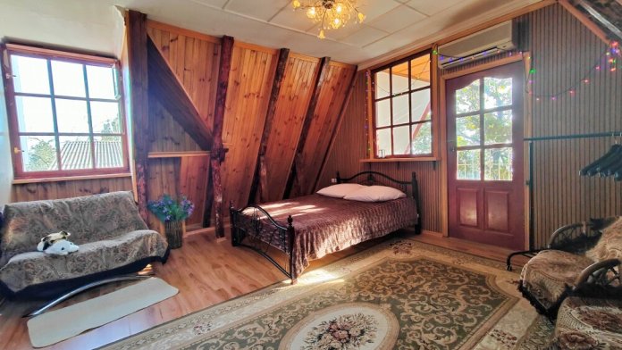Двухкомнатный трёхместный номер с панорамными окнами с видом на море и горы Ай-Петри! Номер выполнен в мансардном стиле. Вся мебель из дерева ручной работы нашего мастера-хозяина гостевого дома. С любовью к каждой детали и заботой о вашем комфорте мы создали уютный и современный номер, оснащённый кондиционером, мощным wi-fi, тв с доступом в интернет, холодильником, электрочайником, обеденной зоной, панорамным балконом и санузлом с видом на море!