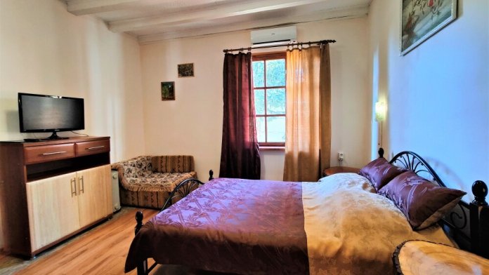 В номерах есть большая двуспальная кровать, раскладной диван, тумбочки, телевизор, кондиционер, холодильник, доступ к Интернету.